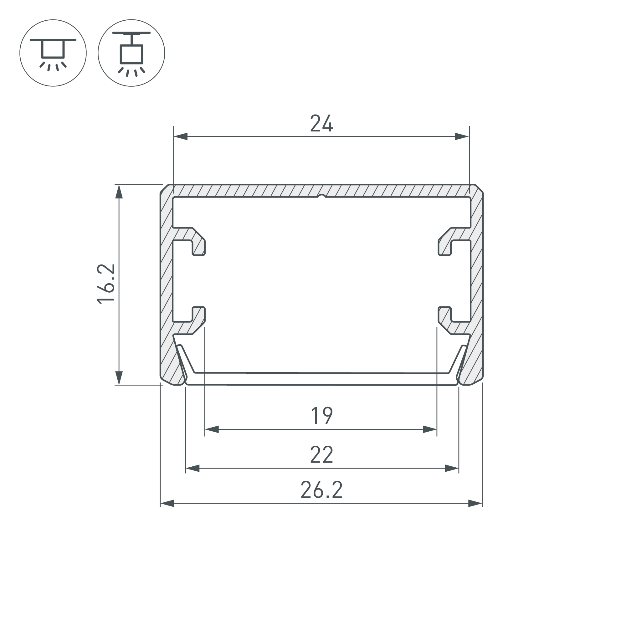 Габаритные размеры профиля составляют 2000 мм в длину, 26,2 мм в ширину и 16,2 мм в высоту. Площадка для установки светодиодных лент позволяет использовать ленту шириной до 24 мм и мощностью до 21,8 Вт/м. Это обеспечивает гибкость в выборе светодиодных лент и создает потрясающие световые решения.