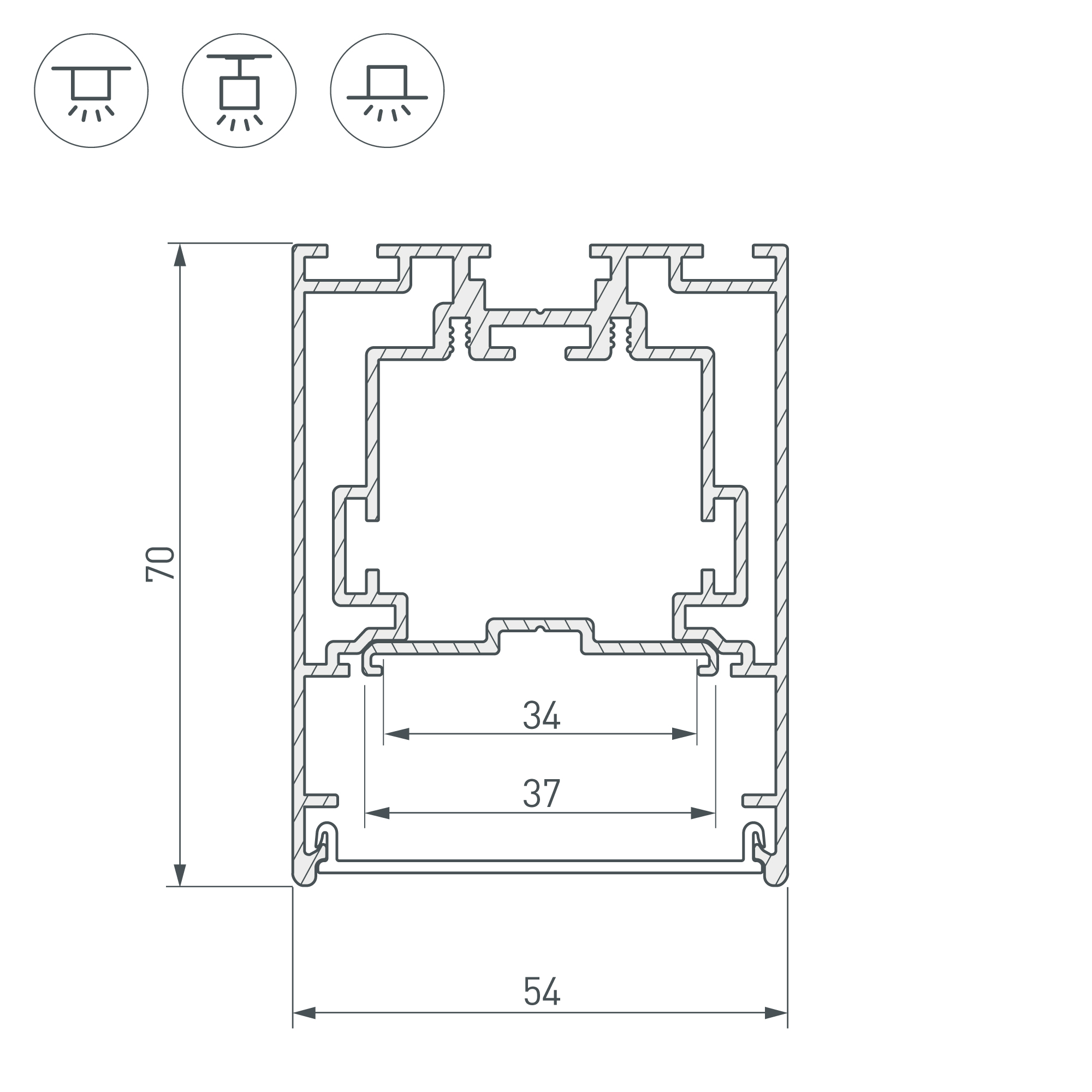 Отсек для блока питания (25х35 мм) и съемная площадка для светодиодной ленты с фиксаторами значительно облегчают сервисное обслуживание осветительного оборудования. Габаритные размеры профиля составляют 2500 мм в длину, 54 мм в ширину и 70 мм в высоту. Площадка для установки светодиодных лент позволяет использовать ленту шириной до 34 мм и мощностью до 65 Вт/м. Это обеспечивает гибкость в выборе светодиодных лент и создает потрясающие световые решения.