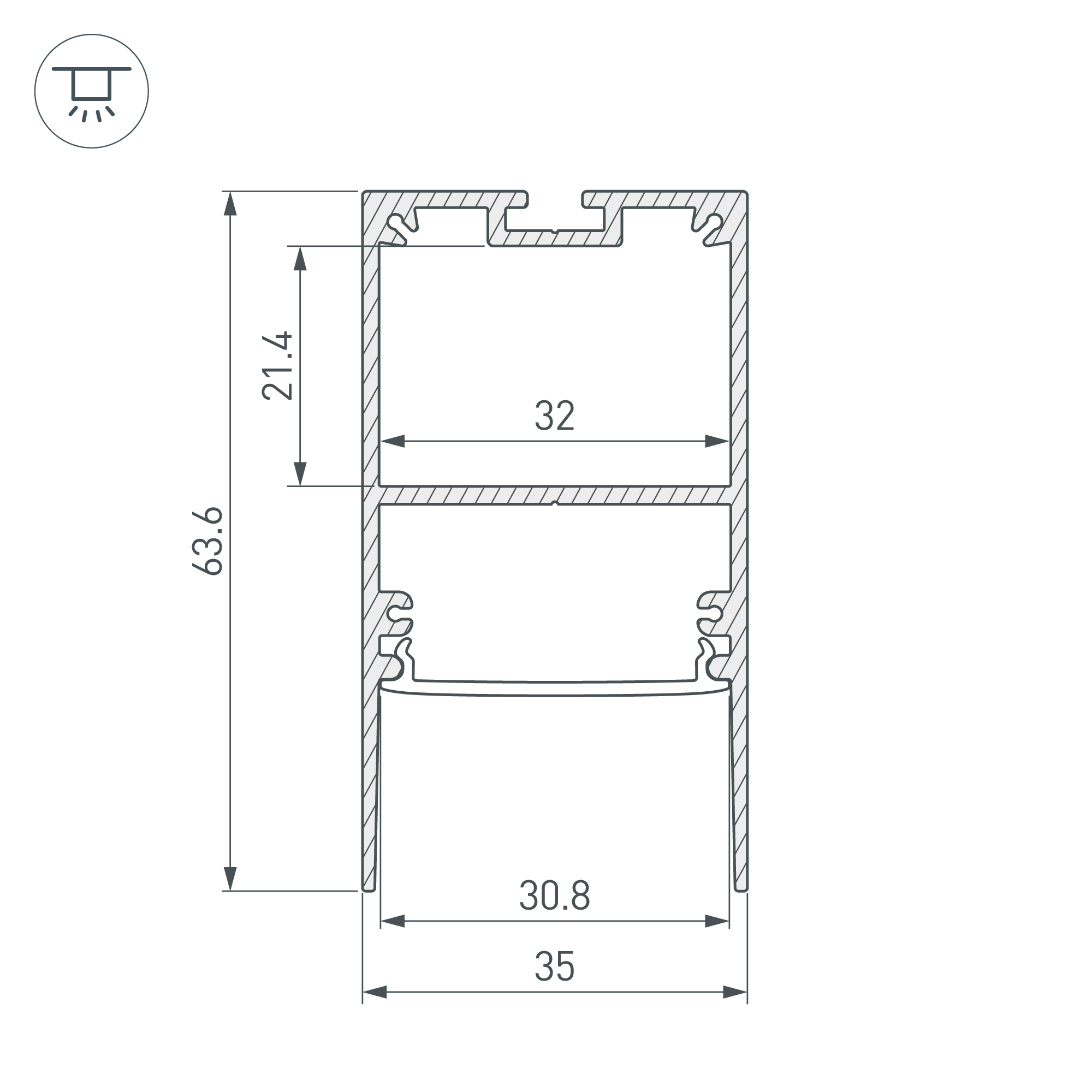 Подвесной/накладной профиль из анодированного алюминия для основной и контурной подсветки помещений. Экран утоплен в плоскости профиля, что позволяет скрыть источник света от прямого контакта с глазами. Габаритные размеры профиля составляют 2000 мм в длину, 35 мм в ширину и 64 мм в высоту. Площадка для установки светодиодных лент позволяет использовать ленту шириной до 32 мм и мощностью до 52 Вт/м. Это обеспечивает гибкость в выборе светодиодных лент и создает потрясающие световые решения.