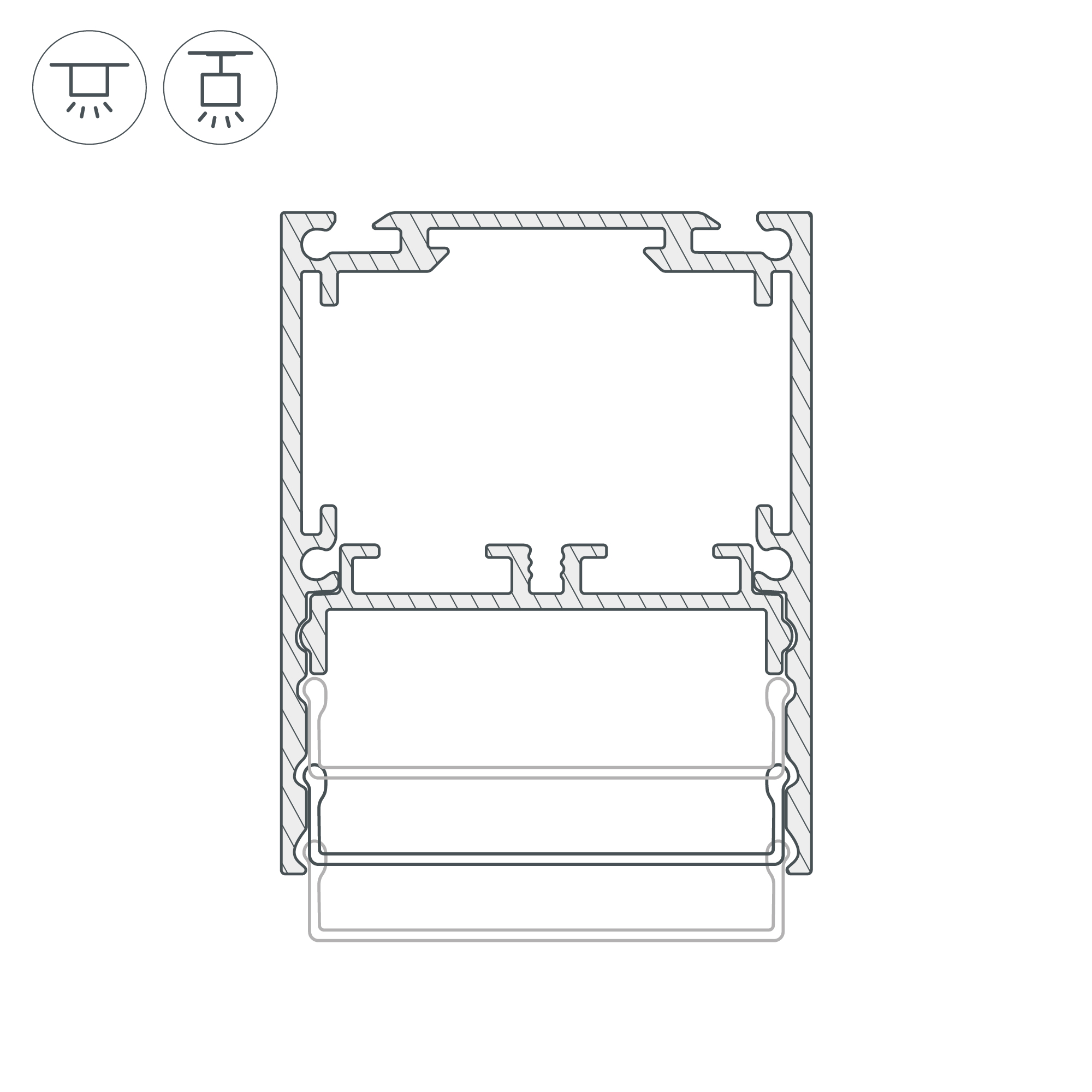 Подвесной/накладной профиль из анодированного алюминия для основного освещения и контурной подсветки. Возможность установки экрана на трех уровнях: выступая за края профиля, вровень с профилем и утоплено, позволяет получить разные световые эффекты.