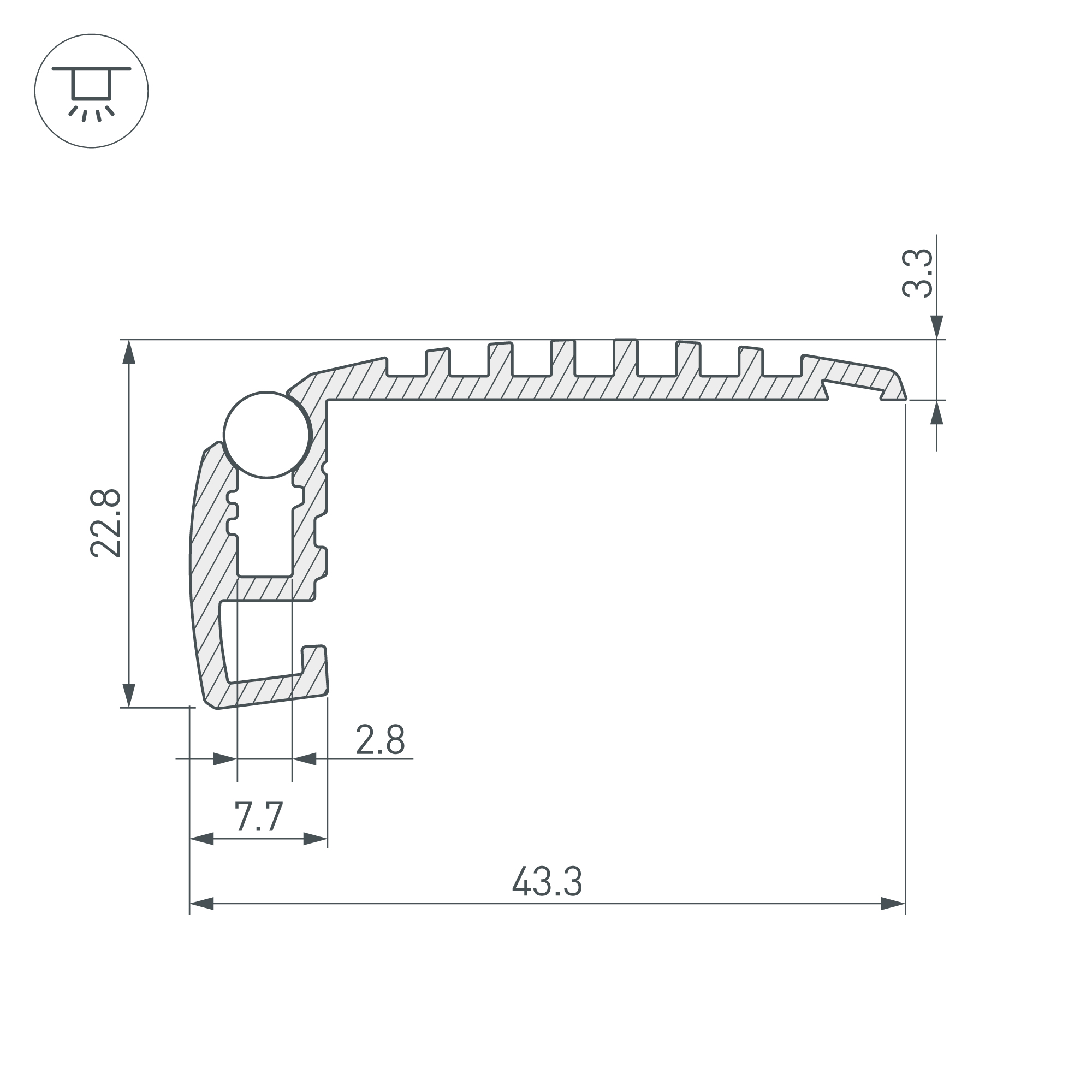 Накладной профиль из анодированного алюминия для подсветки ступеней с антискользящей вставкой. Габаритные размеры профиля составляют 2000 мм в длину, 43,2 мм в ширину и 22,7 мм в высоту. Площадка для установки светодиодных лент позволяет использовать ленту шириной до 5 мм, высотой до 2,6 мм и мощностью до 30,1 Вт/м. Это обеспечивает гибкость в выборе светодиодных лент и создает потрясающие световые решения.