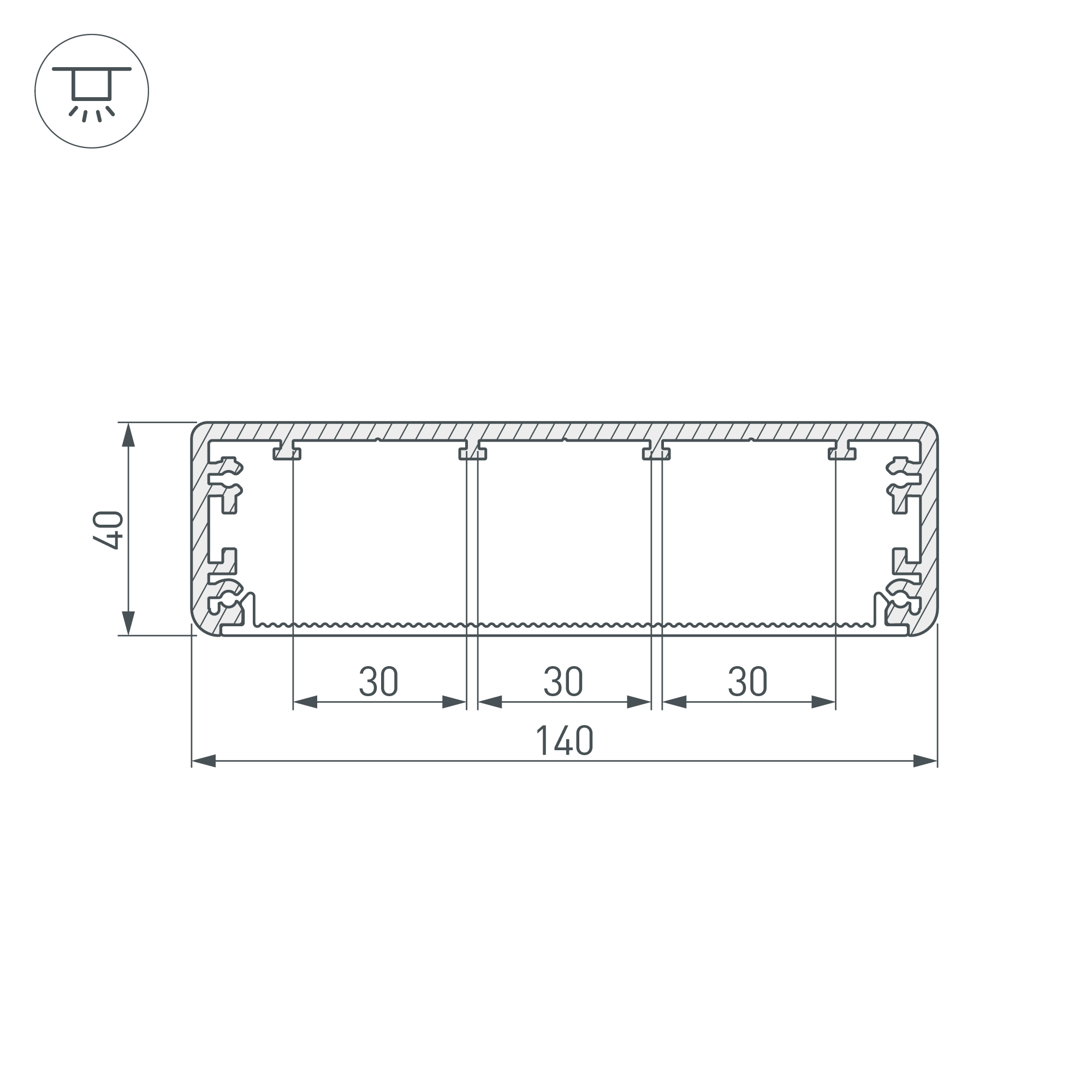 Габаритные размеры профиля составляют 2000 мм в длину, 140 мм в ширину и 40 мм в высоту. Площадка для установки светодиодных лент позволяет использовать ленту шириной до 30 мм и мощностью до 94,5 Вт/м. Это обеспечивает гибкость в выборе светодиодных лент и создает потрясающие световые решения.
