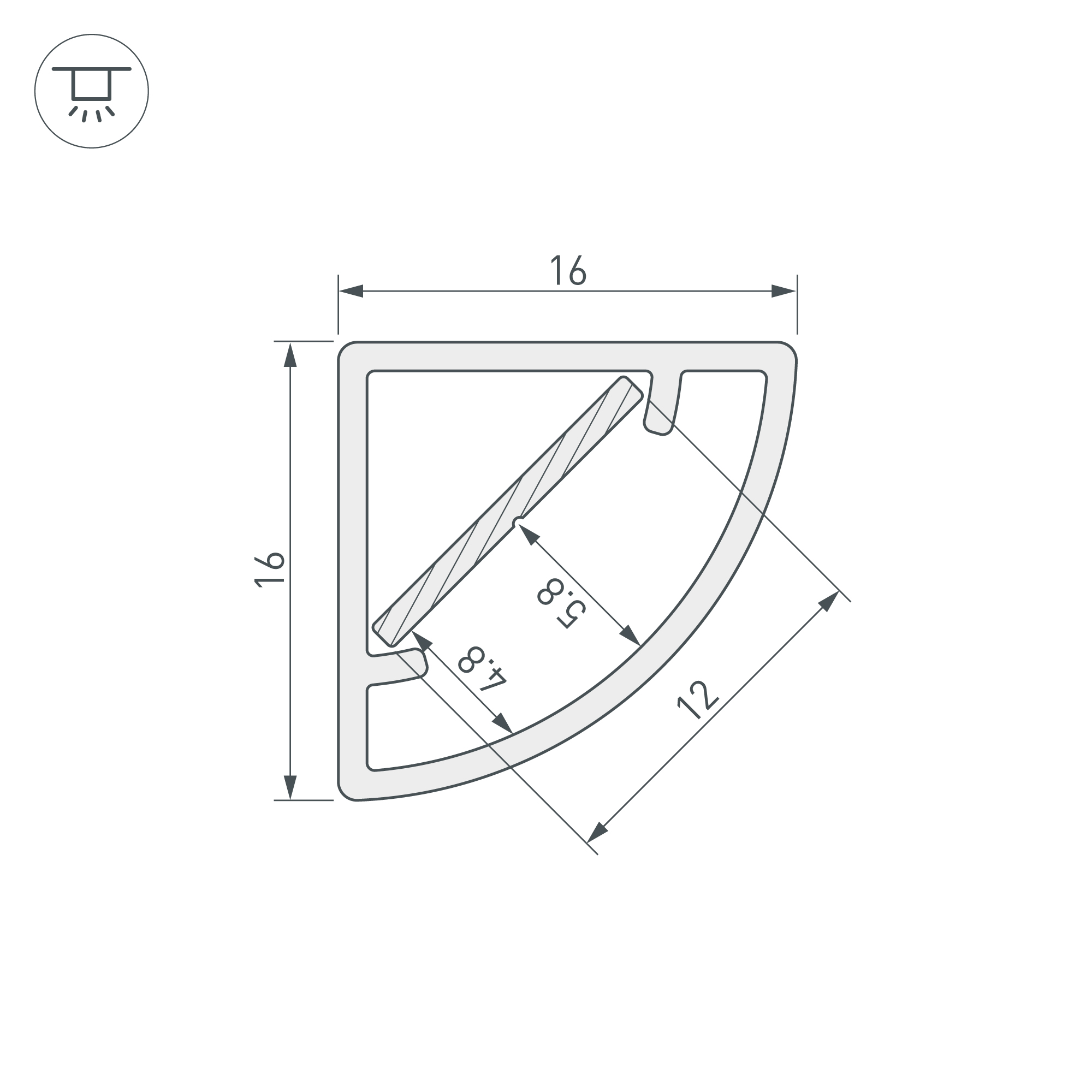 Угловой цельнолитой профиль из поликарбоната со встроенным полукруглым матовым экраном. Габаритные размеры профиля составляют 2000 мм в длину, 16 мм в ширину и 16 мм в высоту. Идущая в комплекте площадка для установки светодиодных лент из алюминия позволяет использовать ленту шириной до 11 мм и мощностью до 7,1 Вт/м. Для установки во влажных помещениях необходима герметизация при помощи двухкомпонентного эпоксидного герметика. Класс пылевлагозащиты – IP65 (при соблюдении технологии герметизации). Этот продукт представляет отличное решение для создания современных световых проектов и обеспечивает надежную и стильную основу для установки светодиодов.