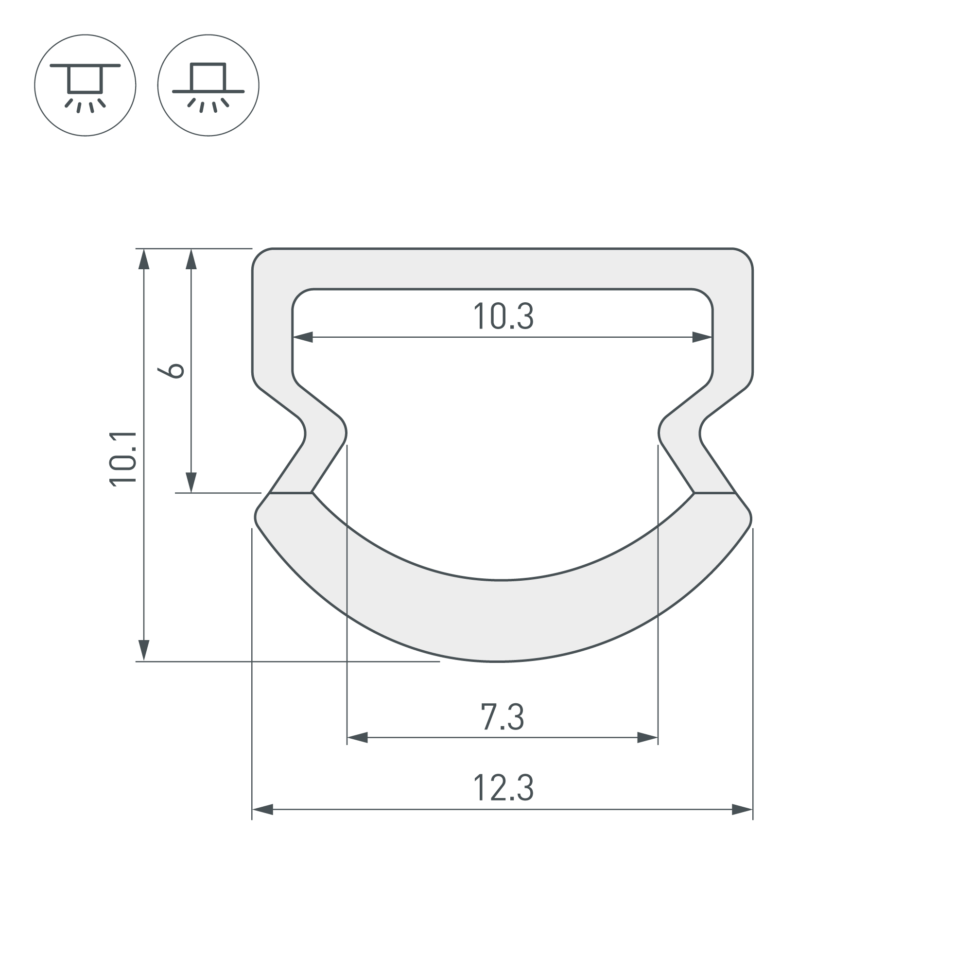 Цельнолитой профиль из поликарбоната со встроенным полукруглым матовым экраном (светопропускание до 77 %). Габаритные размеры профиля составляют 2000 мм в длину, 12,3 мм в ширину и 10,1 мм в высоту. Площадка для установки светодиодных лент позволяет использовать ленту шириной до 8 мм и мощностью до 9,2 Вт/м. Это обеспечивает гибкость в выборе светодиодных лент и создает потрясающие световые решения. Для установки во влажных помещениях необходима герметизация при помощи двухкомпонентного эпоксидного герметика. Класс пылевлагозащиты – IP65 (при соблюдении технологии герметизации). Этот продукт представляет отличное решение для создания современных световых проектов и обеспечивает надежную и стильную основу для установки светодиодов.