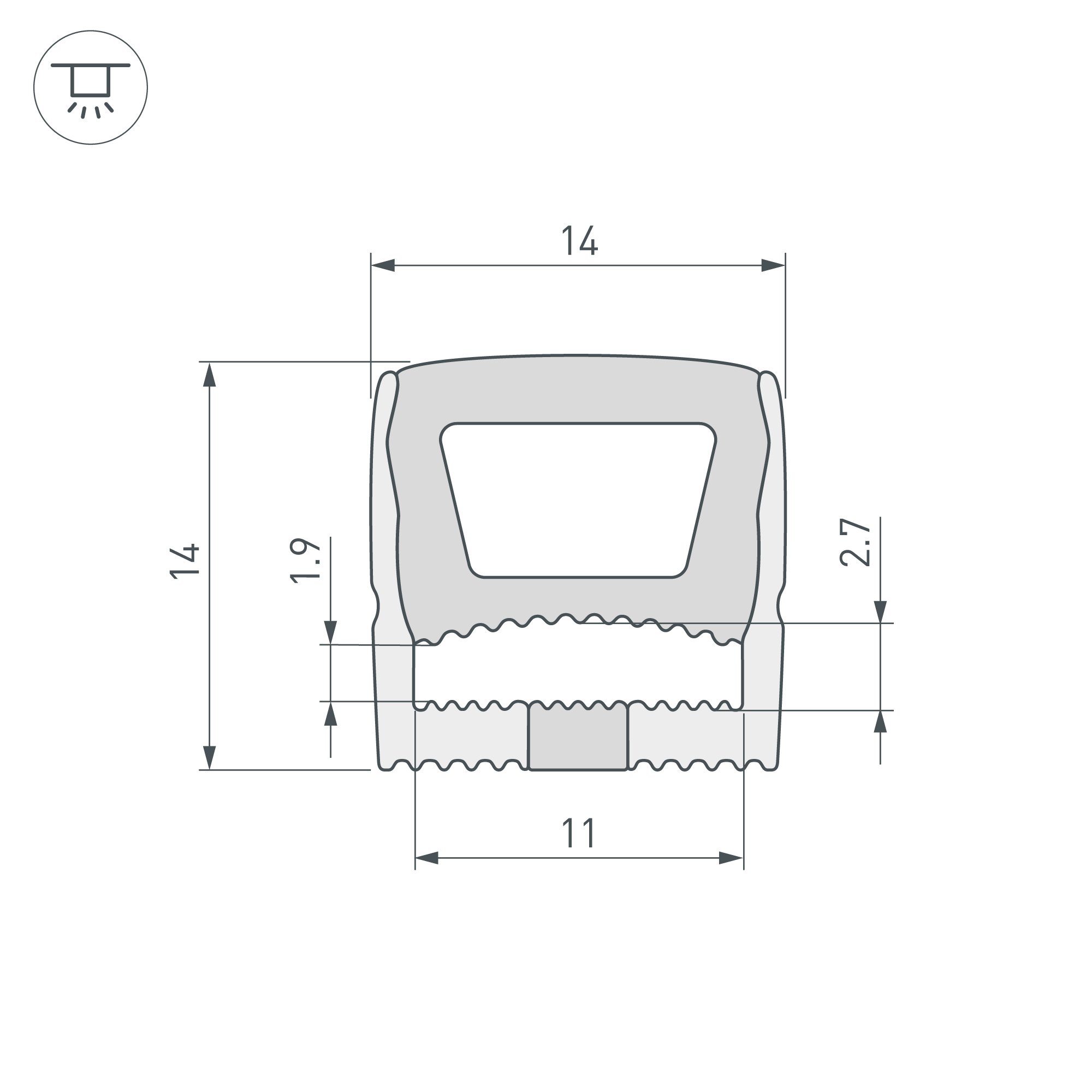 Цельнолитой силиконовый гибкий профиль белого цвета с УФ-защитой. Габаритные размеры профиля составляют 50000 мм в длину, 14 мм в ширину и 14 мм в высоту. Вертикальный изгиб TOP, минимальный радиус изгиба 60 мм. Угол излучения 115°. Для удобства установки ленты по всей длине профиля протянута нить. Площадка для установки светодиодных лент позволяет использовать ленту шириной от 10 до 11 мм, высотой до 2,5 мм и мощностью до 10 Вт/м. Это обеспечивает гибкость в выборе светодиодных лент и создает потрясающие световые решения. Для установки во влажных помещениях необходима герметизация при помощи двухкомпонентного эпоксидного герметика. Класс пылевлагозащиты – IP65 (при соблюдении технологии герметизации). Этот продукт представляет отличное решение для создания современных световых проектов и обеспечивает надежную и стильную основу для установки светодиодов.
