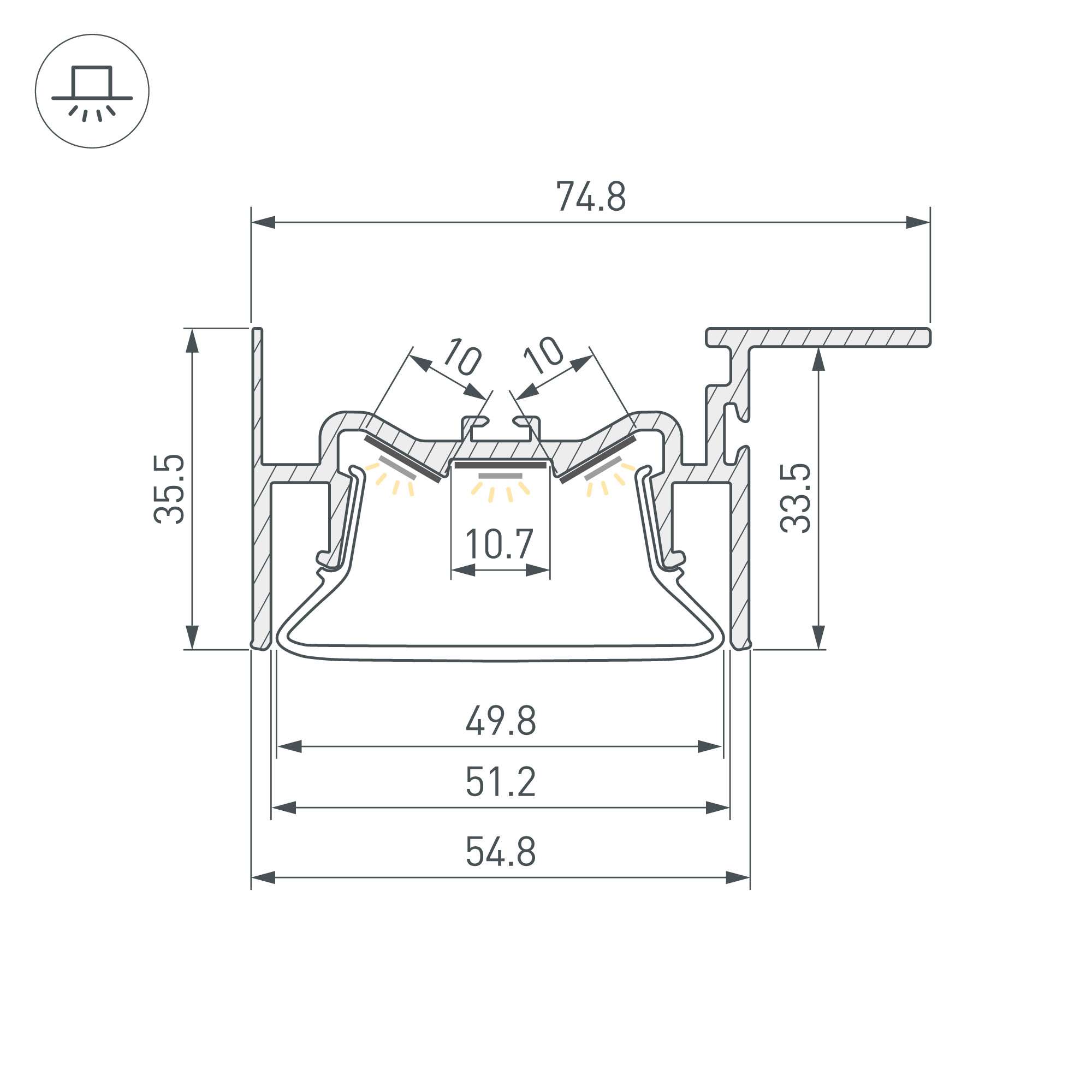 Габаритные размеры профиля составляют 2000 мм в длину, 75 мм в ширину и 36 мм в высоту. Площадки для установки светодиодных лент позволяют использовать ленты шириной до 10 мм и мощностью до 53,8 Вт/м (общая мощность для трех лент). Это обеспечивает гибкость в выборе светодиодных лент и создает потрясающие световые решения.