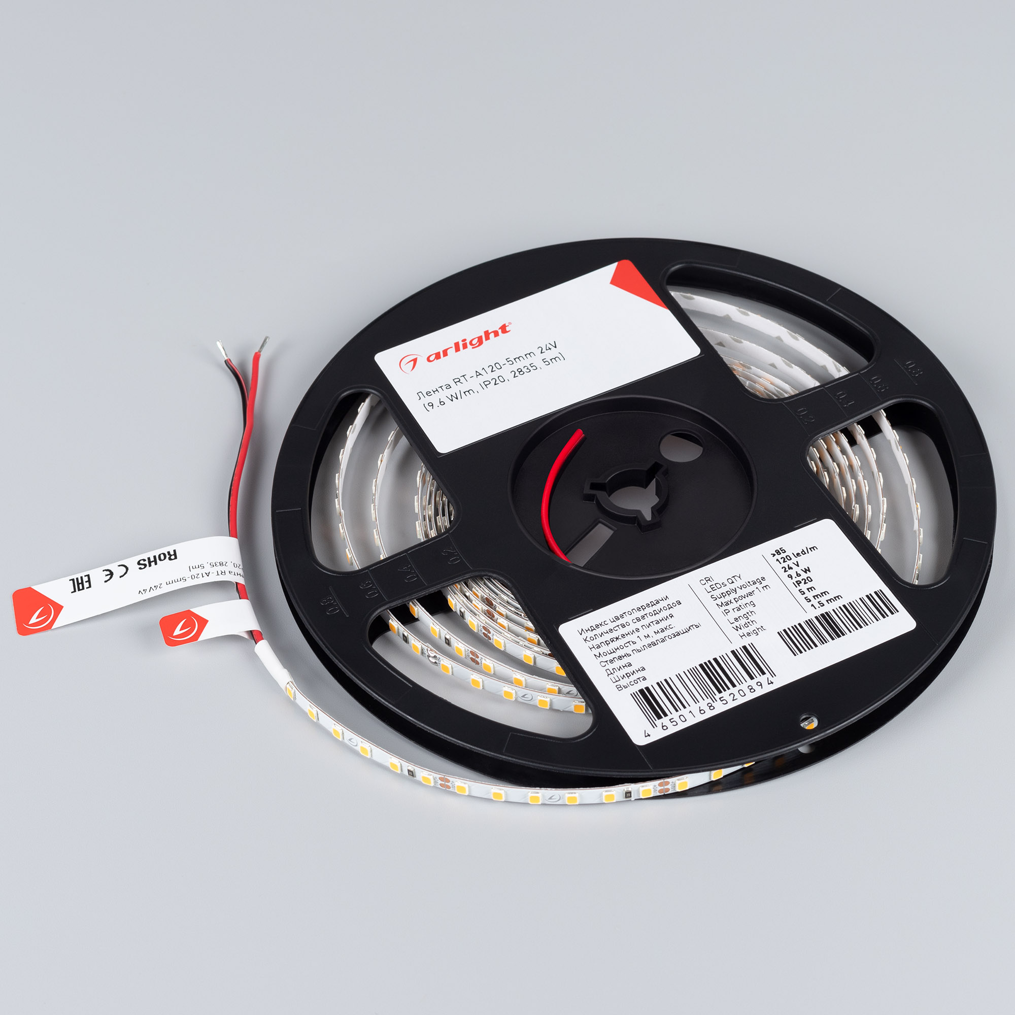 Узкая светодиодная лента RT серии A120 шириной 5 мм. Тип светодиода SMD 2835, 120 шт/м, белого цвета свечения (6000K). Напряжение питания 24 В, мощность 9.6 Вт/м. Минимальный отрезок 50 мм (6 светодиодов). Универсальная лента для организации декоративной подсветки в помещениях, подсветка лестниц, ступеней, перил, плинтусов, ниш, мебельных полок, натяжных потолков, витражей. Узкая плата плата позволяет установить ленту в тонкий паз. Используется для рекламных конструкций и витрин.
