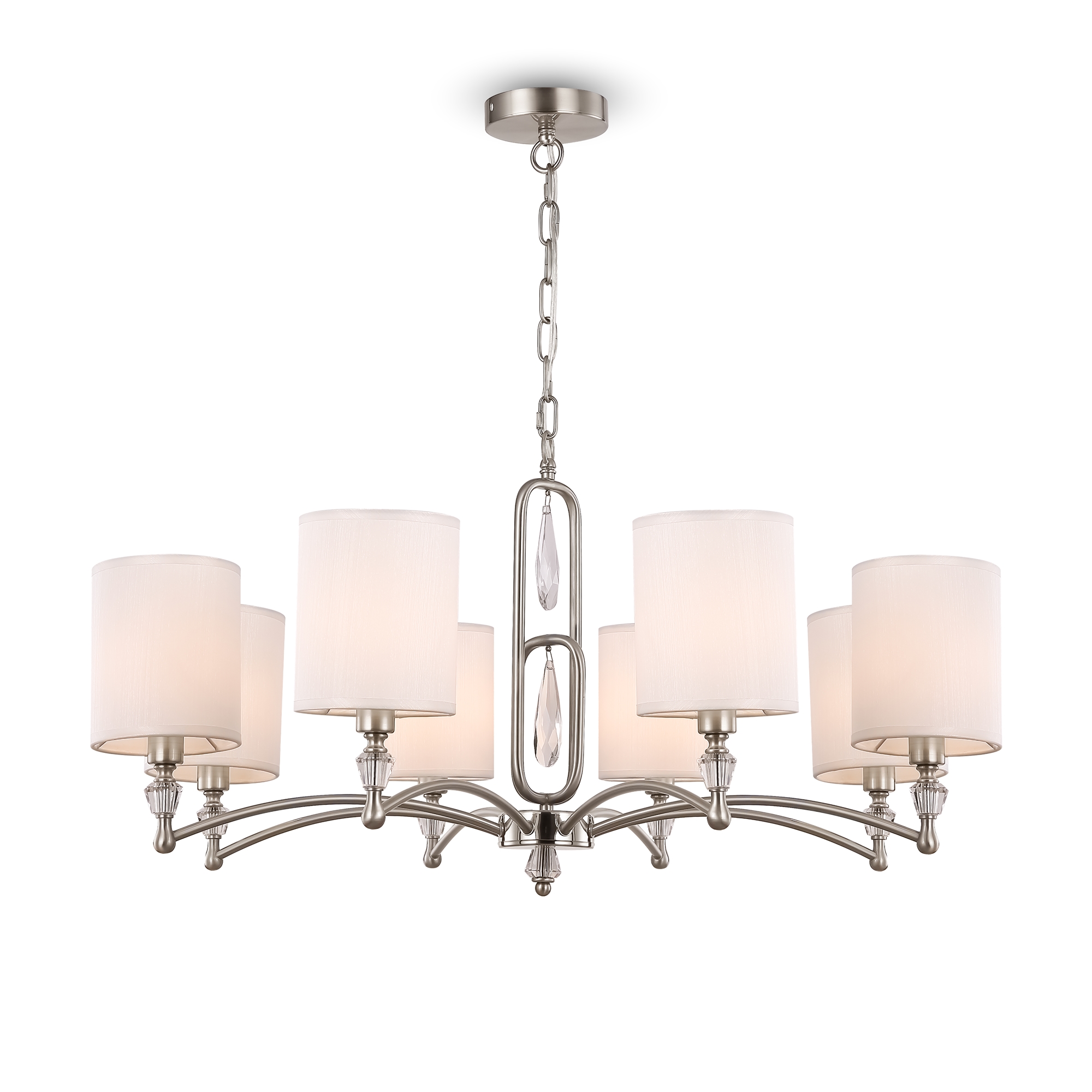 Материал арматуры – нержавеющая сталь, цвет – хром. Материал абажуров – текстиль на ПВХ, цвет – белый. Декор – прозрачное стекло. Акцентные стеклянные кристаллы на рожках со сложной огранкой.