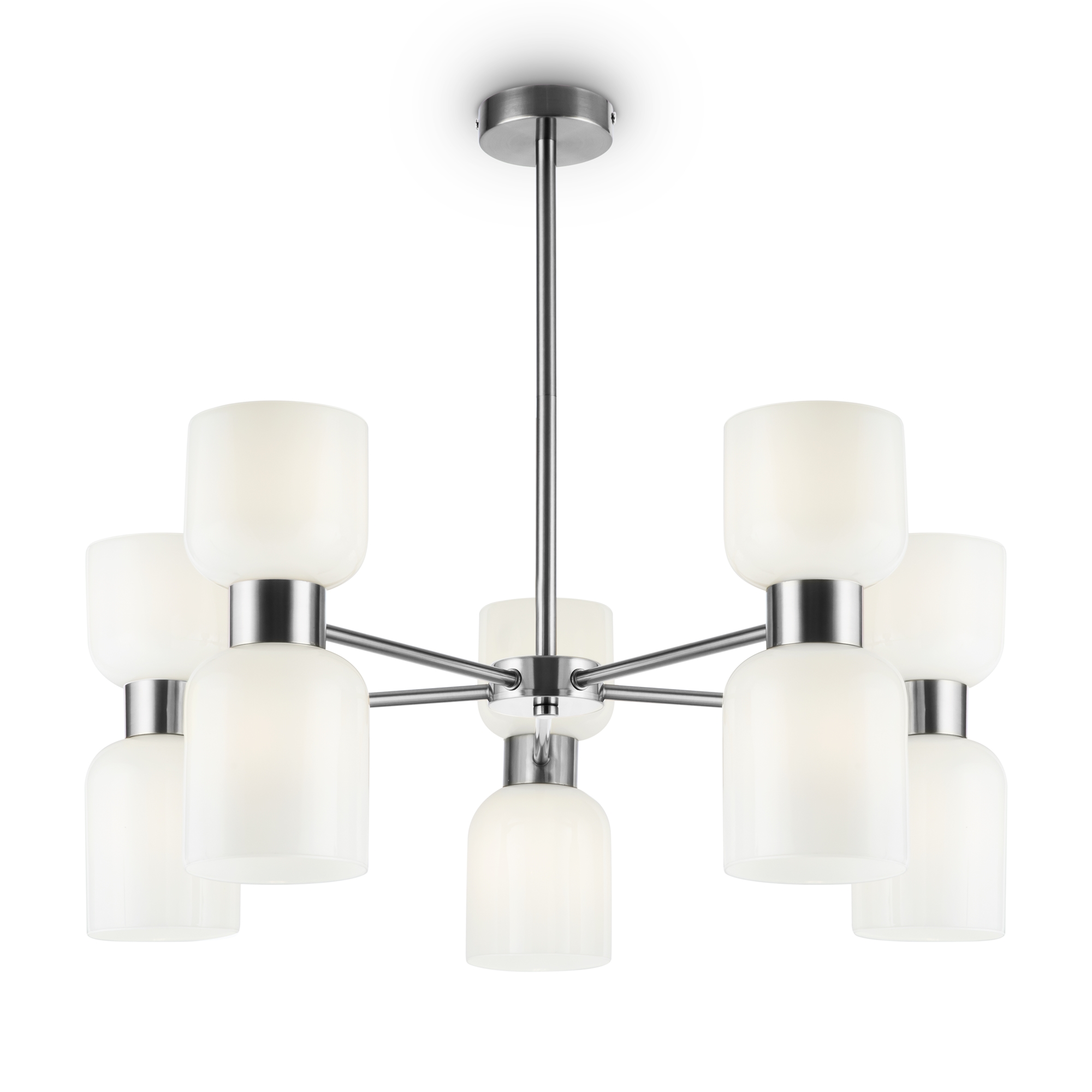 Арматура из металла. Оттенки – хром и латунь. Стеклянные плафоны в двух цветовых решениях: белый глянец и хром с зеркальным эффектом. Оригинальная форма плафонов «песочные часы», двунаправленный световой поток. Широкий ассортимент. Источник света – лампа с цоколем E27.