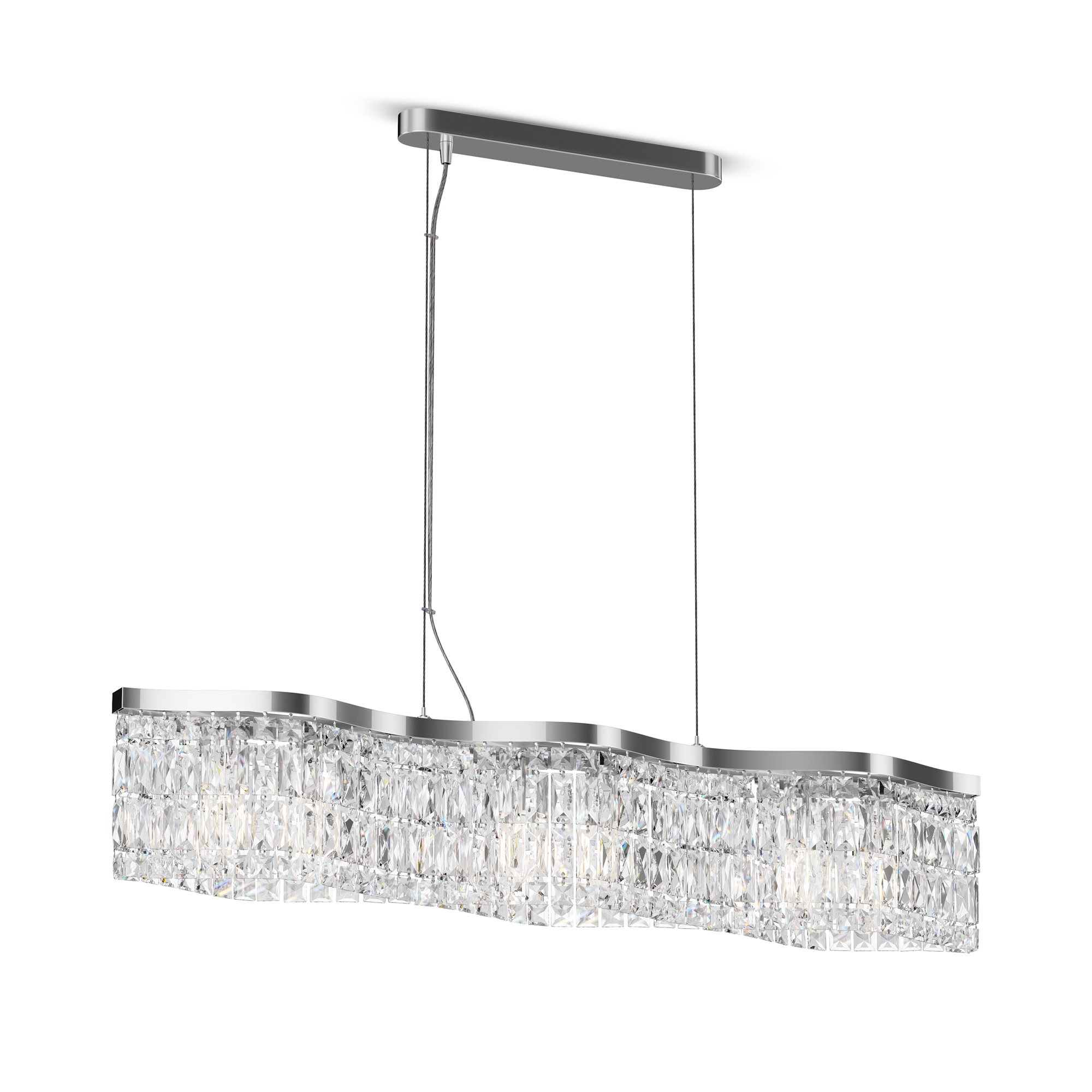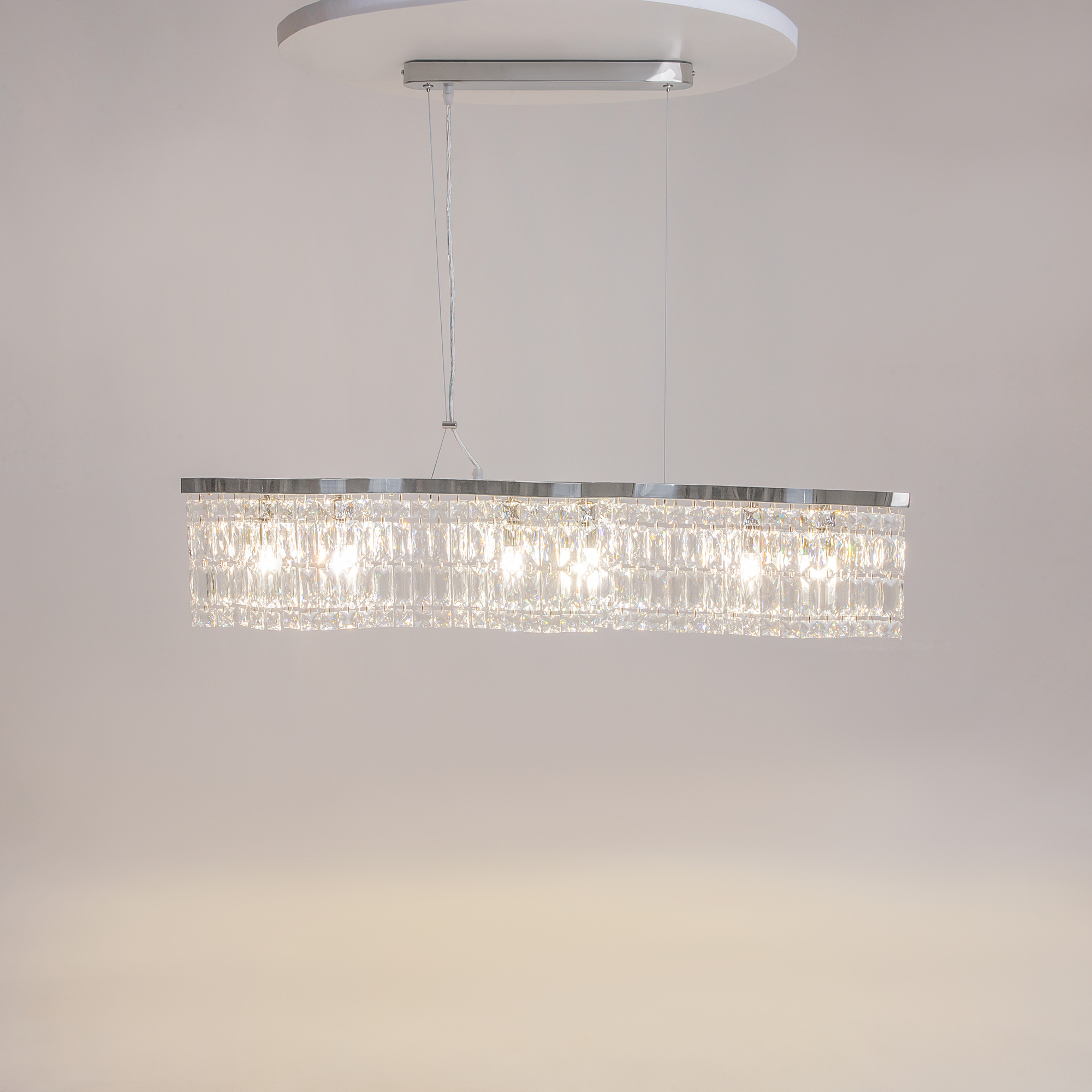 Металлическая арматура в двух оттенках: хром. золото. Декор – прозрачные кристаллы. Потолочные модели имеют два яруса подвесок. Высота подвесной люстры регулируется тросом.