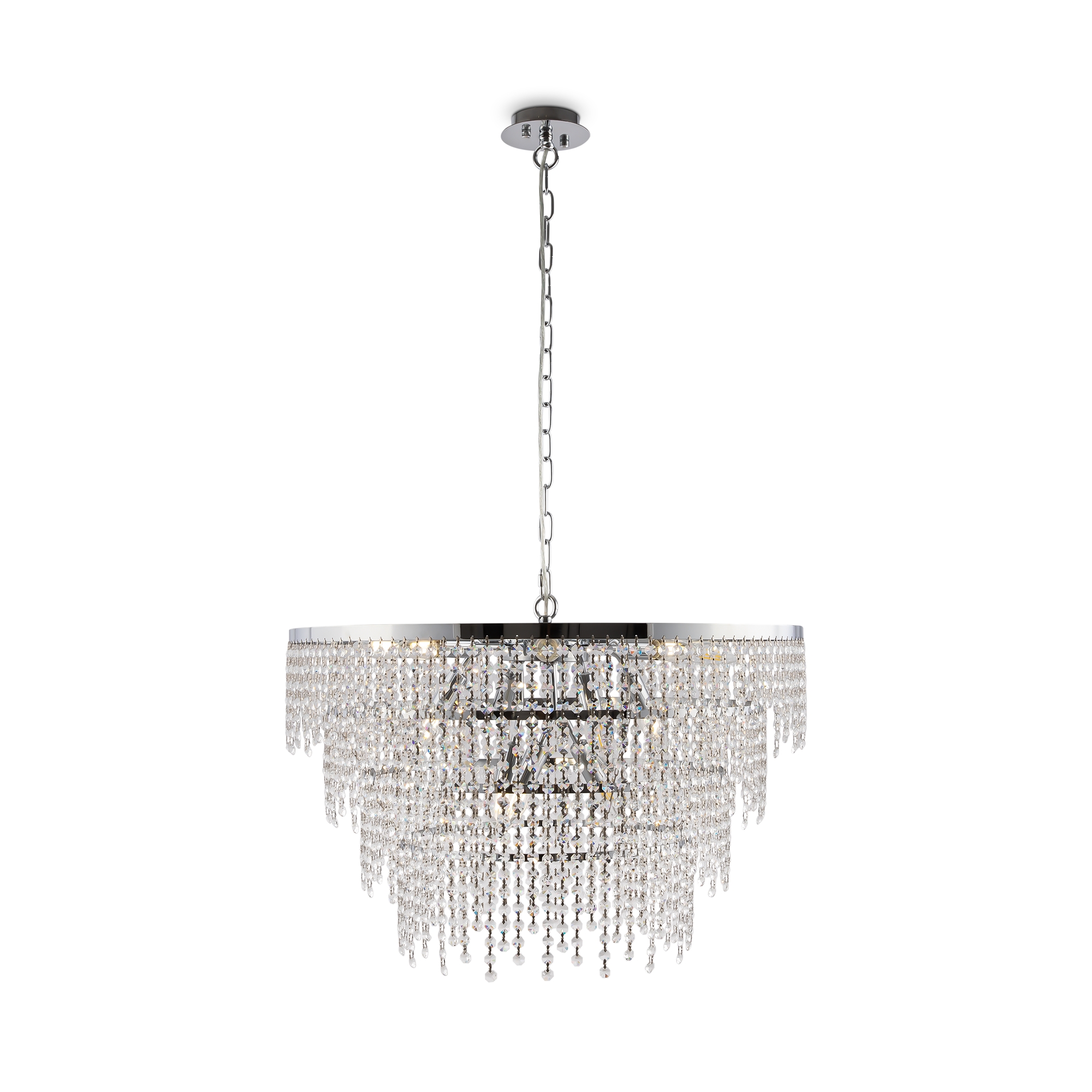 Материал арматуры – металл, цвет – хром. Многоярусный стеклянный декор. Эффектная игра света. Визуально легкий дизайн. Высокие параметры освещенности. Регулируемая высота