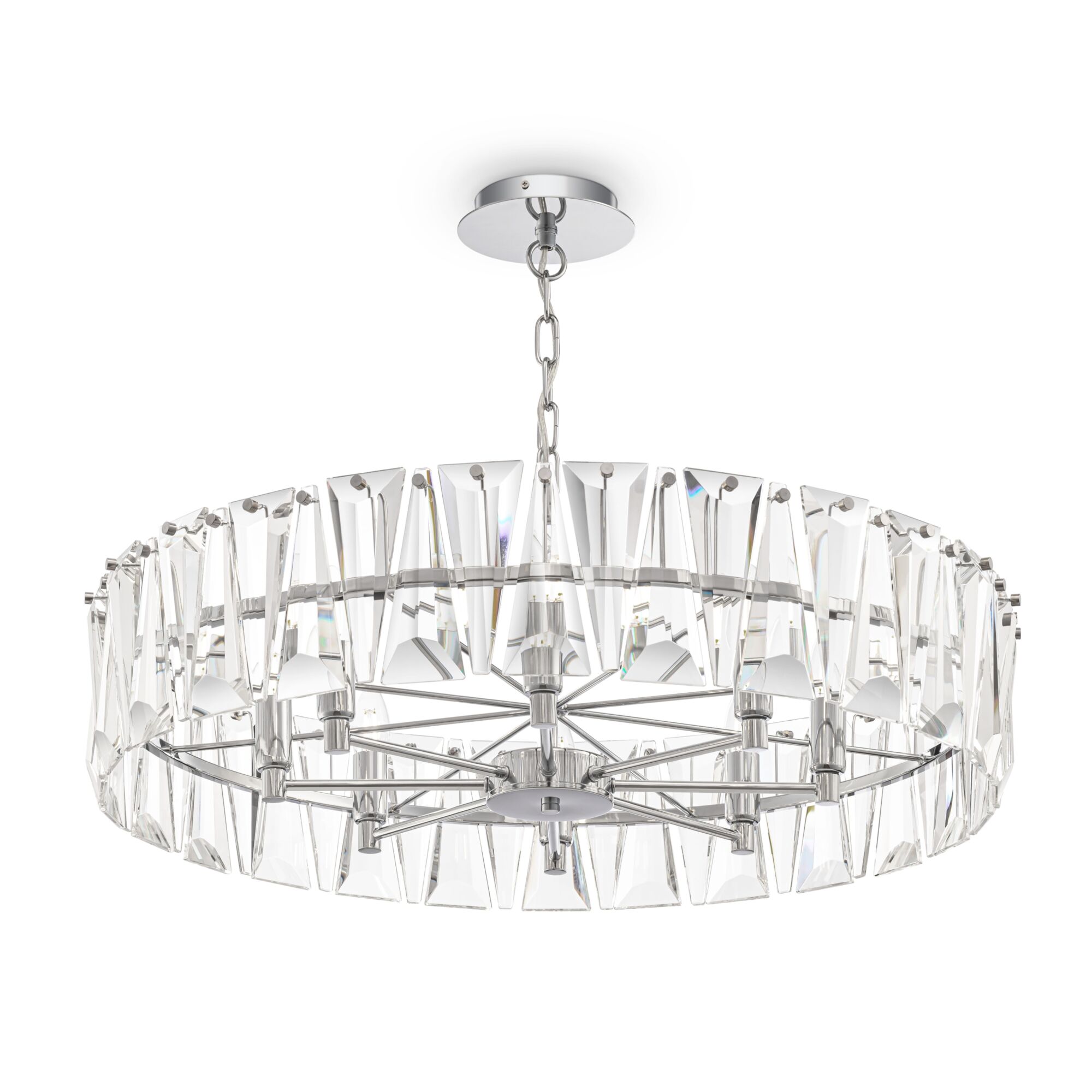 Материал арматуры – металл, оттенки – хром и золото. Декор – массивные крис таллы сложной огранки. Высота подвесных моделей регулируется длиной цепи. Источник света – лампа с цоколем Е14.