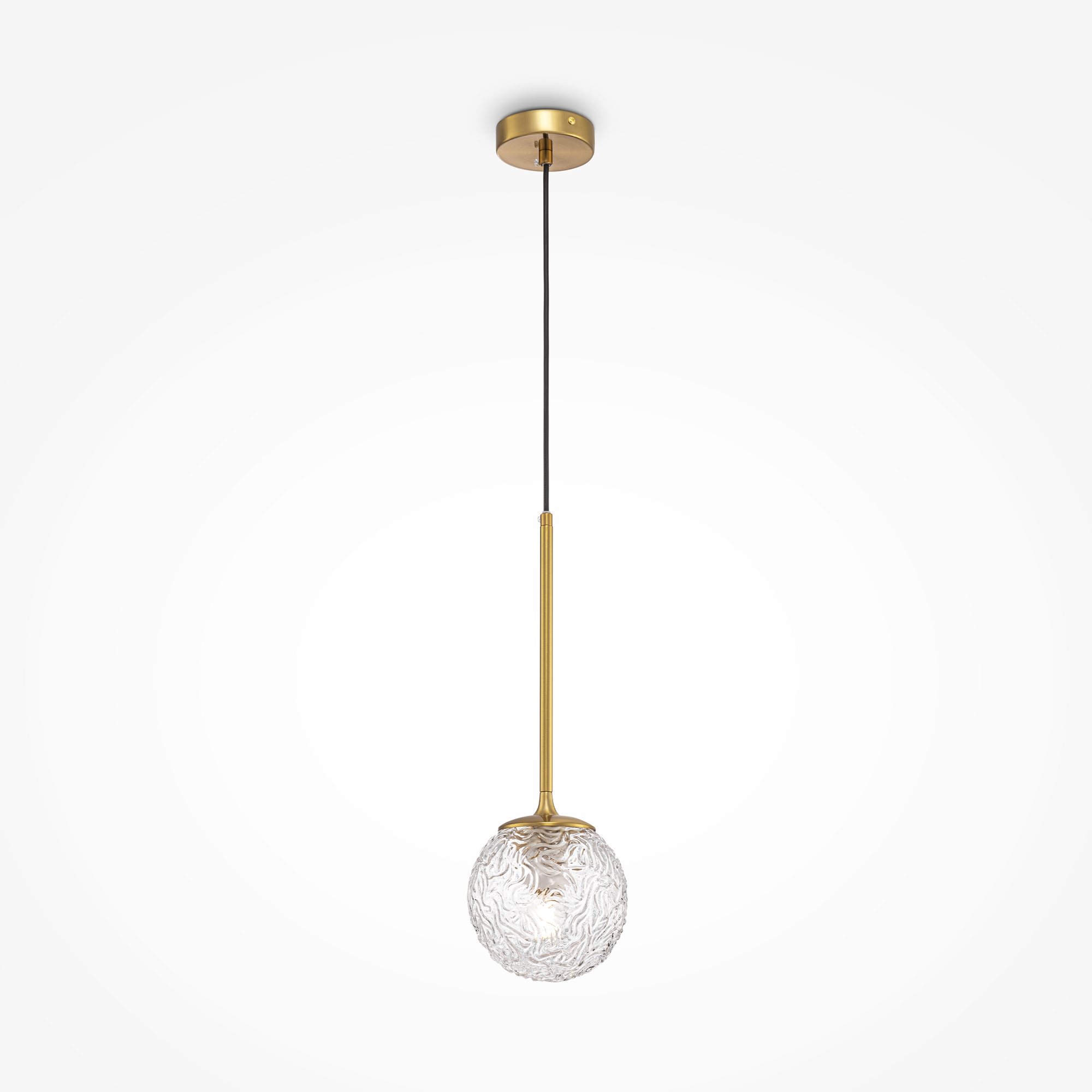 Арматура — металл, цвет — латунь. Плафоны — прозрачное стекло с эффектом муара. Высота подвесного светильника регулируется. Источник света — лампа с цоколем Е27.