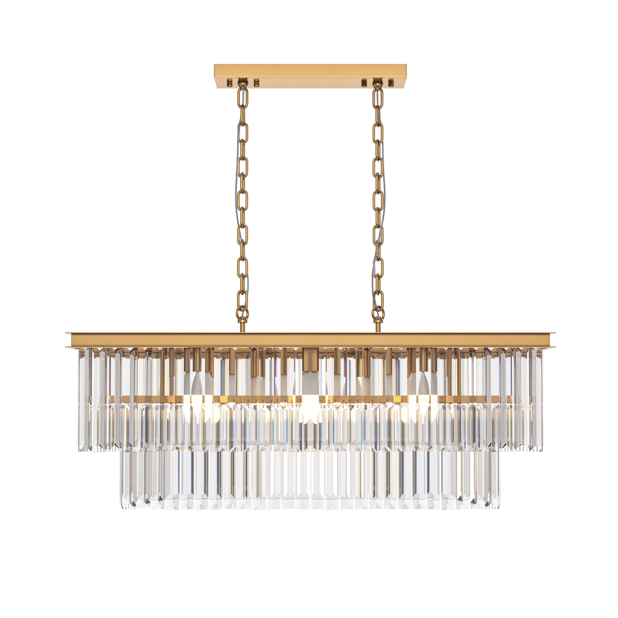 Арматура из металла в трех оттенках: латунь, хром, золото. Многоярусный декор. Подвески: прозрачное (арматура – хром, латунь) и янтарное (арматура – золото) стекло. Высота подвесных моделей регулируется.