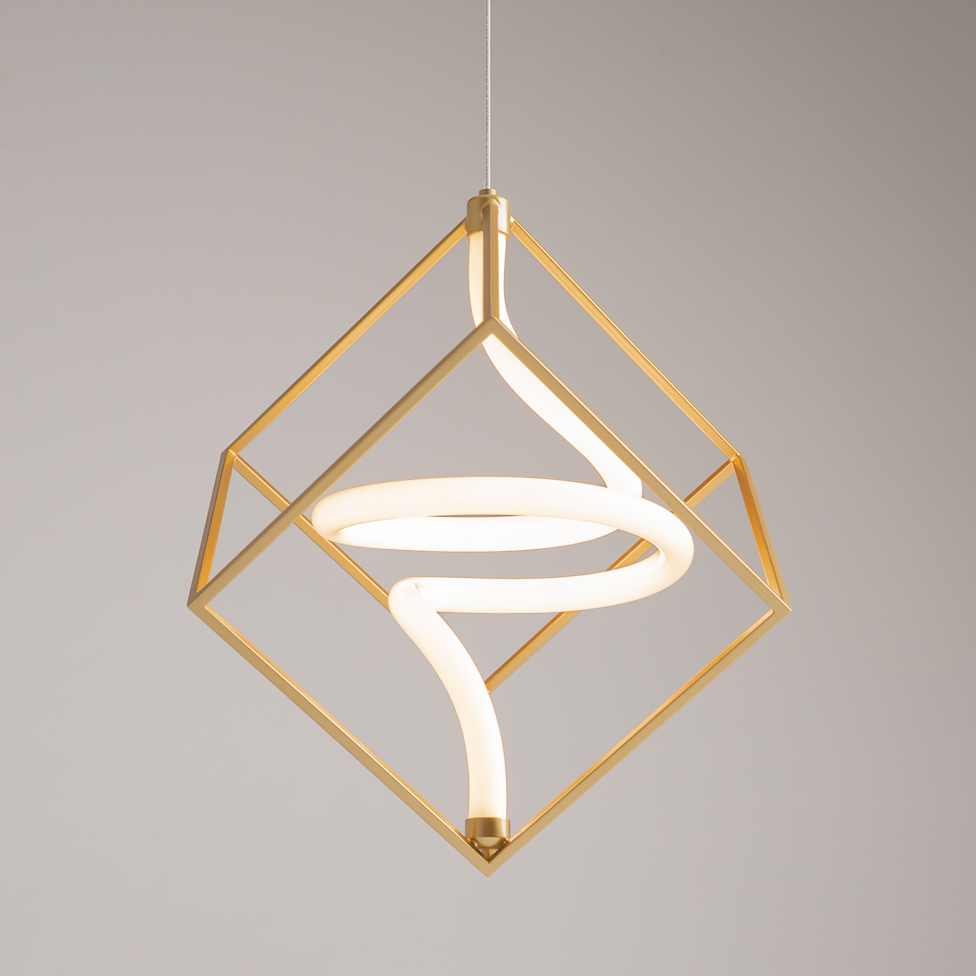 Металлическая арматура, цвет – латунь. Графичный силуэт. Источник света – гибкая неоновая трубка, расположенная внутри арматуры. Угол рассеивания — 120 градусов. Дизайн светильников подходит для интерьера в стиле лофт, а также индустриального стиля. Регулируемый провод подвесного светильника — 3 м.