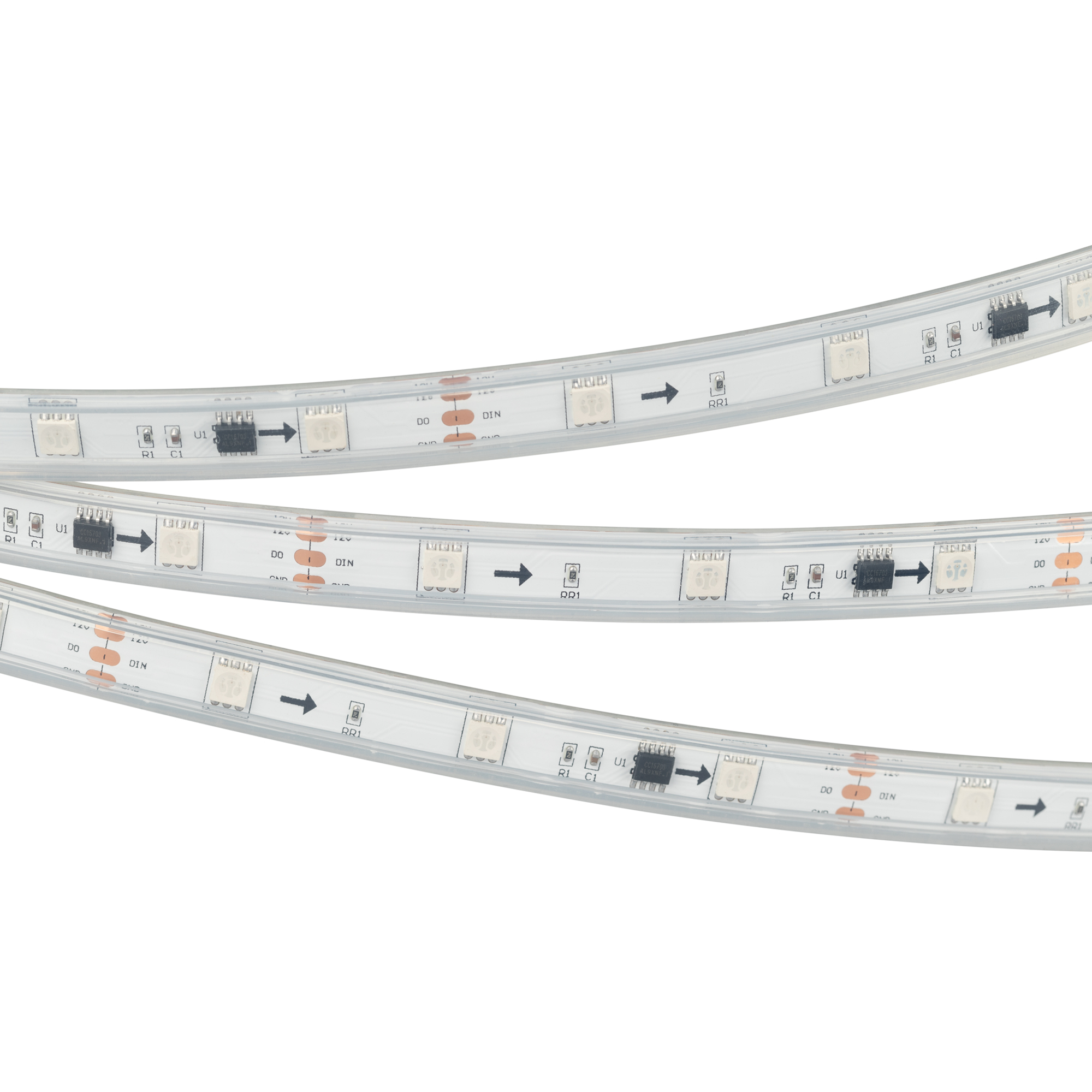 Герметичная лента SPI «Бегущий огонь» с микросхемой 16703, IP66. Управление через внешний контроллер (совместимый c микросхемами TM1812, UCS1903, GS8206, WS2812–2815) по стандартному протоколу SPI. Используется для воспроизведения многоцветных световых эффектов различной сложности: от простейших эффектов до воспроизведения динамических изображений на мультимедийных экранах. Применяется для создания рекламных вывесок, оформление витрин, помещений для дискотек, ресторанов, театрализованных шоу.