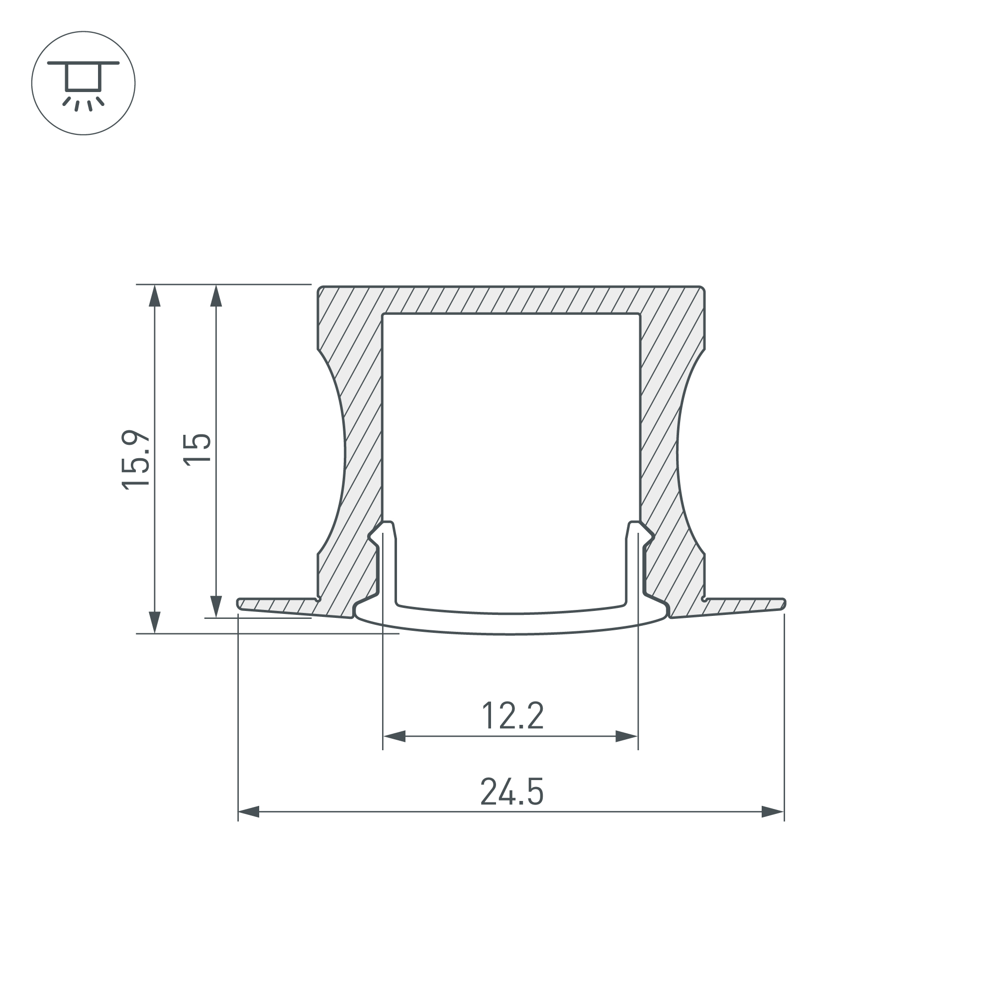 Габаритные размеры профиля составляют 2000 мм в длину, 24,5 мм в ширину и 15 мм в высоту. Площадка для установки светодиодных лент позволяет использовать ленту шириной до 12,2 мм и мощностью до 19,2 Вт/м. Это обеспечивает гибкость в выборе светодиодных лент и создает потрясающие световые решения.