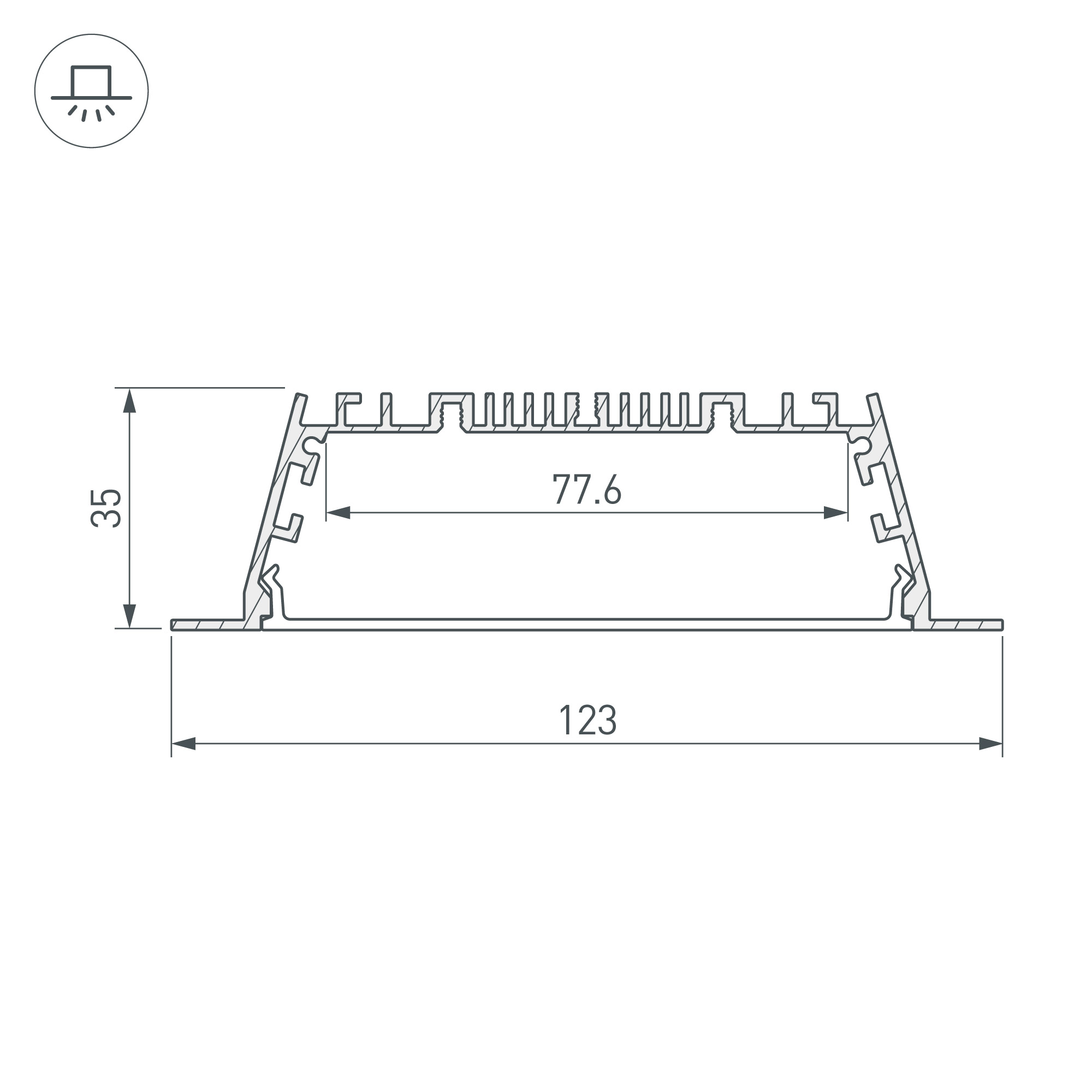 Габаритные размеры профиля составляют 2000 мм в длину, 123 мм в ширину и 35 мм в высоту. Площадка для установки светодиодных лент позволяет использовать ленту шириной до 77 мм и мощностью до 52 Вт/м. Это обеспечивает гибкость в выборе светодиодных лент и создает потрясающие световые решения.