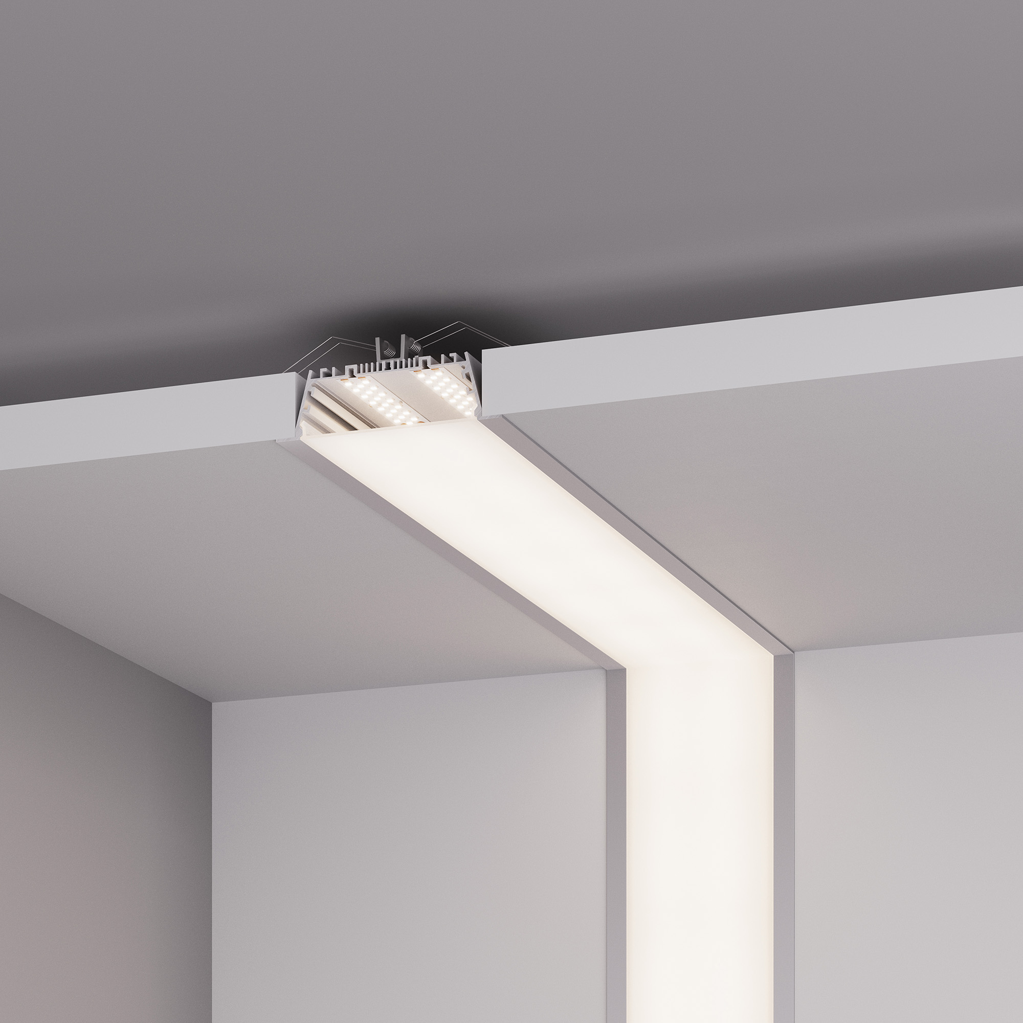 Встраиваемый профиль с накладным фланцем из анодированного алюминия для основного освещения и контурной подсветки в комплекте с матовым рассеивателем со светопропусканием 67% .
