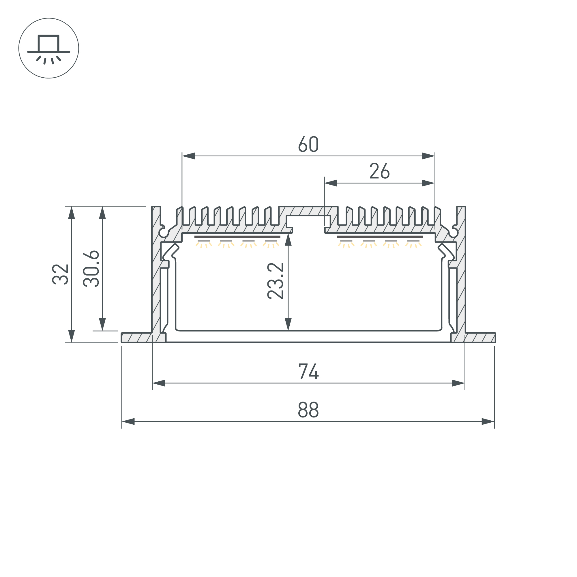 Габаритные размеры профиля составляют 2500 мм в длину, 88 мм в ширину и 32 мм в высоту. Площадка для установки светодиодных лент позволяет использовать ленту шириной до 60 мм и мощностью до 59,7 Вт/м. Это обеспечивает гибкость в выборе светодиодных лент и создает потрясающие световые решения.