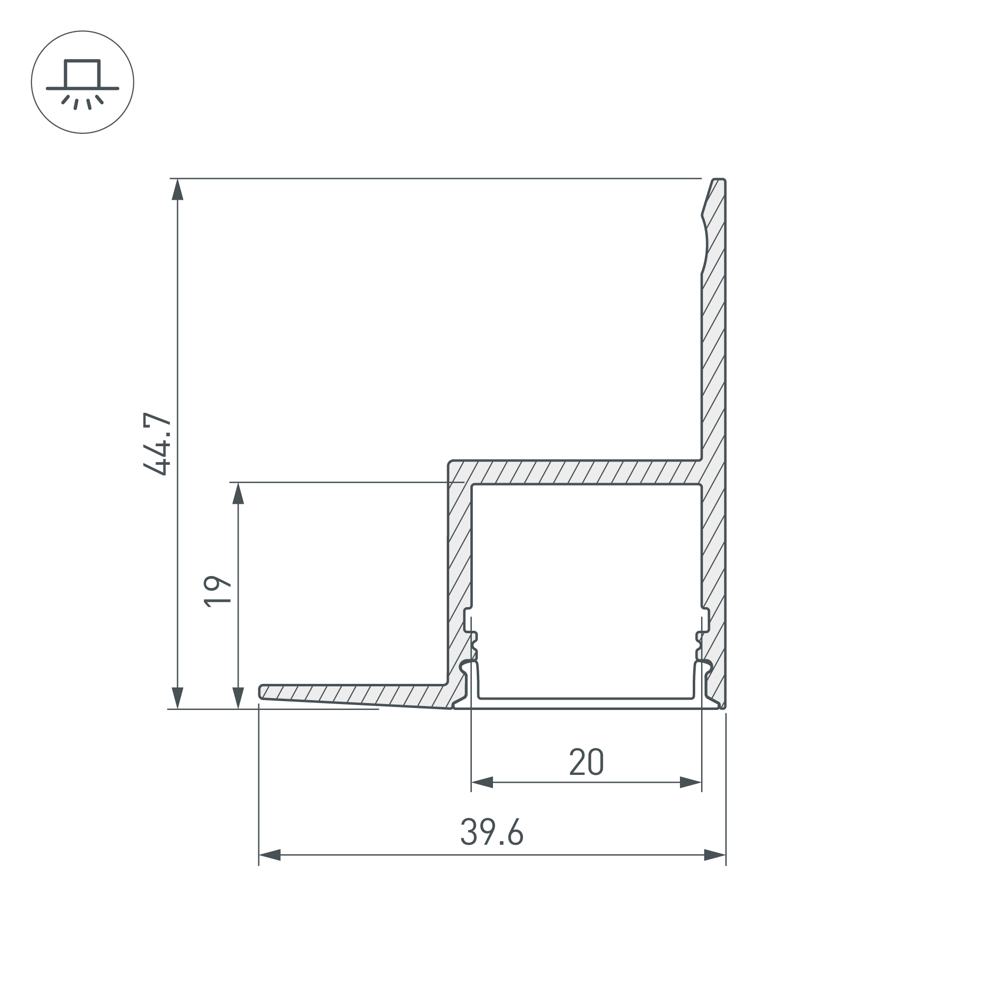 Габаритные размеры профиля составляют 2000 мм в длину, 44,7 мм в ширину и 39,6 мм в высоту. Площадка для установки светодиодных лент позволяет использовать ленту шириной до 20 мм и мощностью до 37,4 Вт/м. Это обеспечивает гибкость в выборе светодиодных лент и создает потрясающие световые решения.
