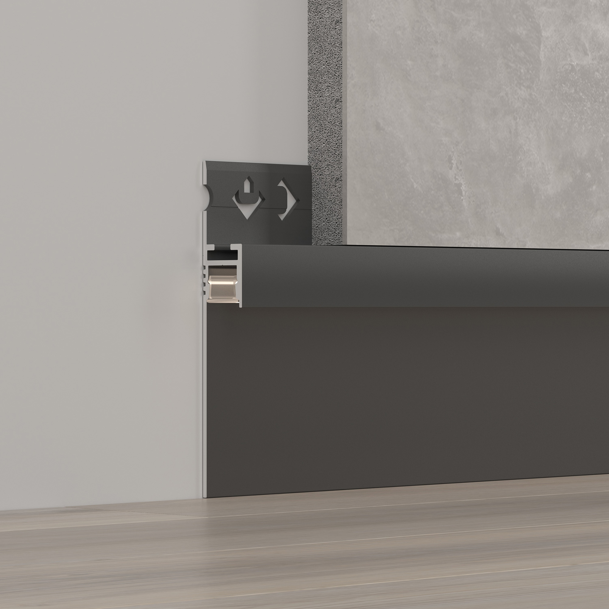 Алюминиевый профиль черного цвета, встраиваемый в гипсокартон, под строительную отделку. Служит как декоративная накладка для подсветки пола и стен, создавая мягкое свечение по периметру помещения, эффект парящей стены или потолка, не является плинтусом.