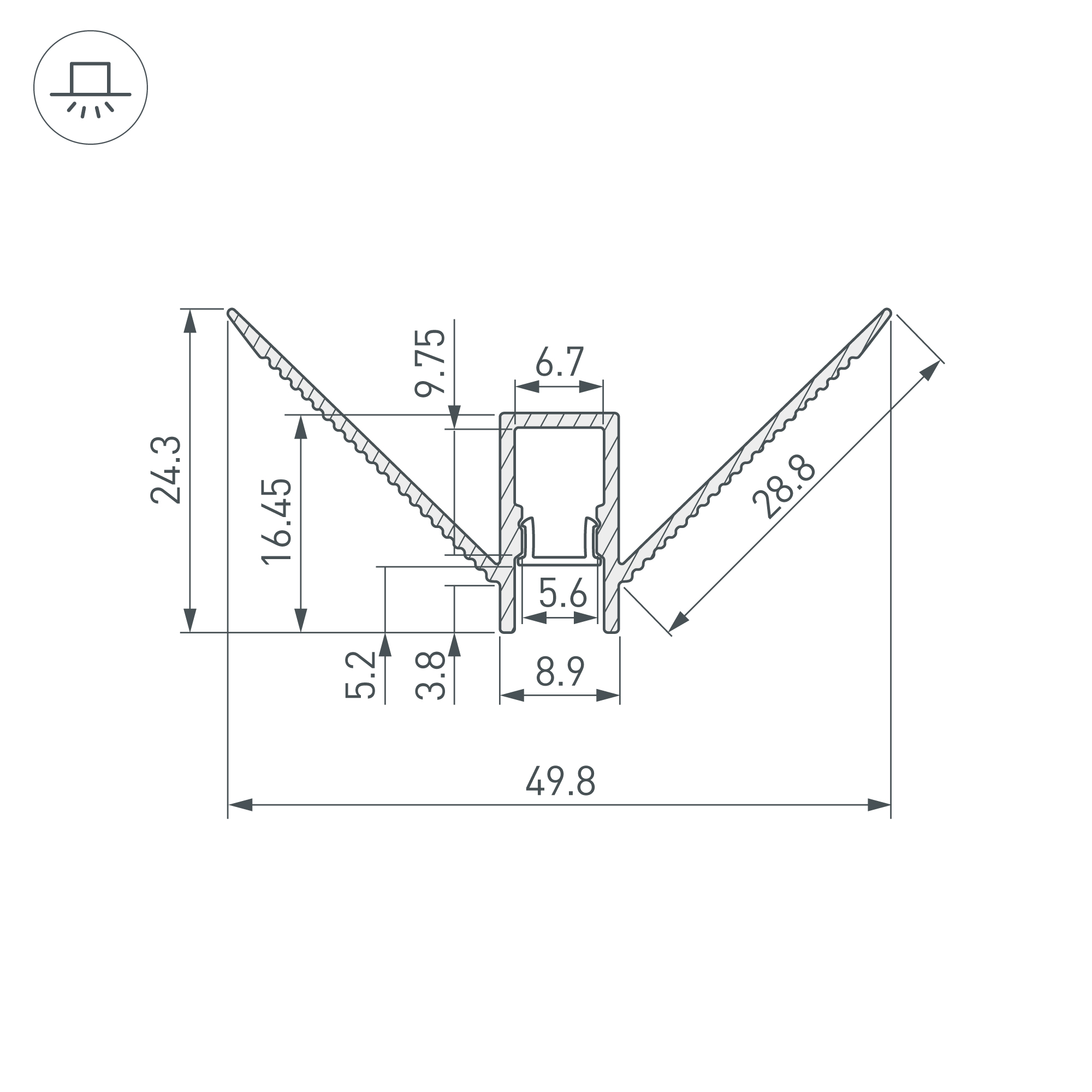Габаритные размеры этого профиля составляют 2000 мм в длину, 49,8 мм в ширину и 24,3 мм в высоту. Площадка для установки светодиодных лент позволяет использовать ленту шириной до 6,7 мм и мощностью до 21 Вт/м. Это обеспечивает гибкость в выборе светодиодных лент и создает потрясающие световые решения.