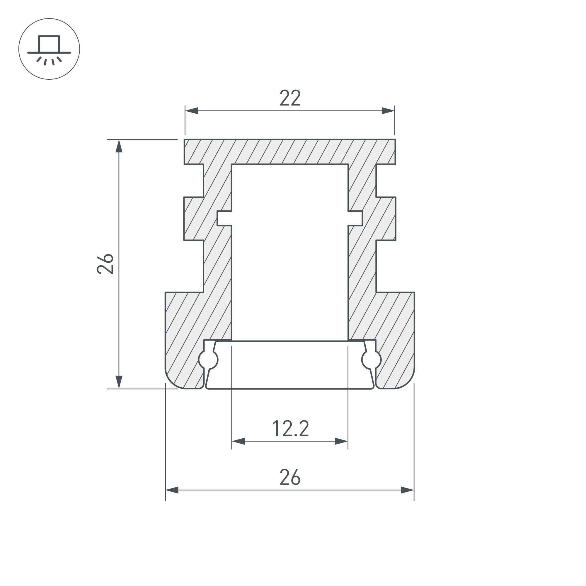 Габаритные размеры профиля составляют 2000 мм в длину, 26 мм в ширину и 26 мм в высоту. Площадка для установки светодиодных лент позволяет использовать ленту шириной до 12,2 мм и мощностью до 25 Вт/м. Это обеспечивает гибкость в выборе светодиодных лент и создает потрясающие световые решения.
