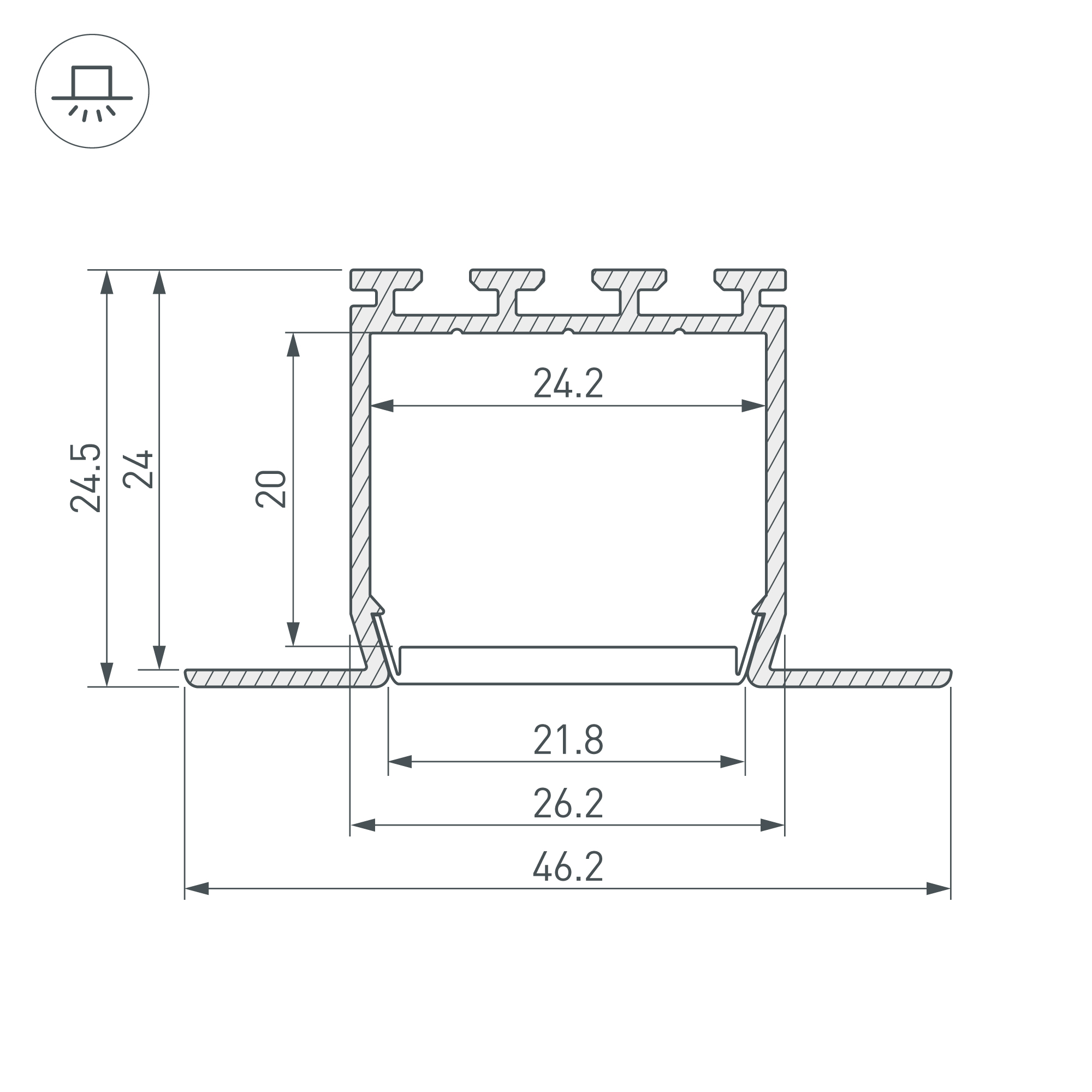 Габаритные размеры профиля составляют 2000 мм в длину, 46,2 мм в ширину и 24,5 мм в высоту. Площадка для установки светодиодных лент позволяет использовать ленту шириной до 24,2 мм и мощностью до 33,2 Вт/м. Это обеспечивает гибкость в выборе светодиодных лент и создает потрясающие световые решения.