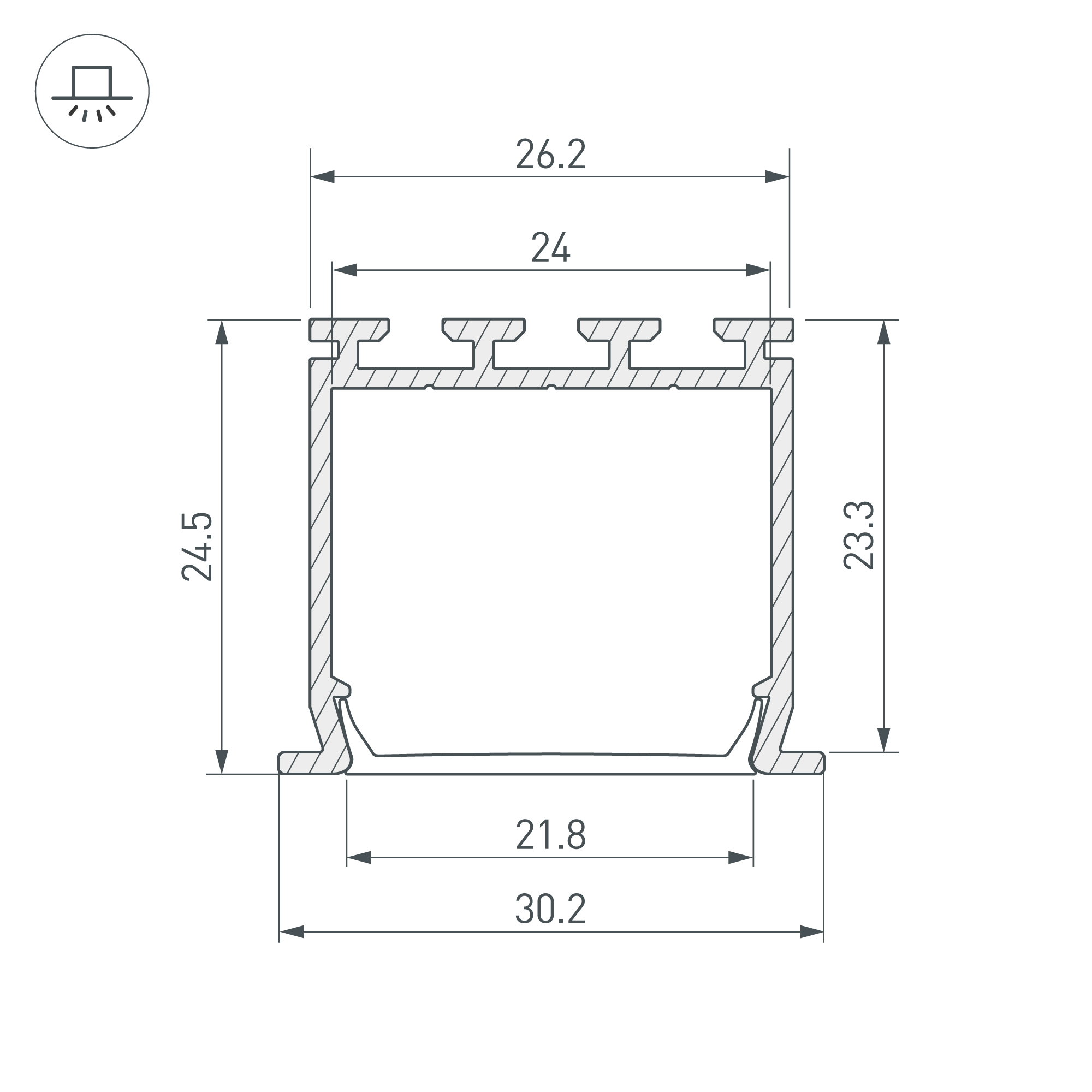 Габаритные размеры профиля составляют 2000 мм в длину, 30 мм в ширину и 25 мм в высоту. Площадка для установки светодиодных лент позволяет использовать ленту шириной до 24 мм и мощностью до 27,5 Вт/м. Это обеспечивает гибкость в выборе светодиодных лент и создает потрясающие световые решения.