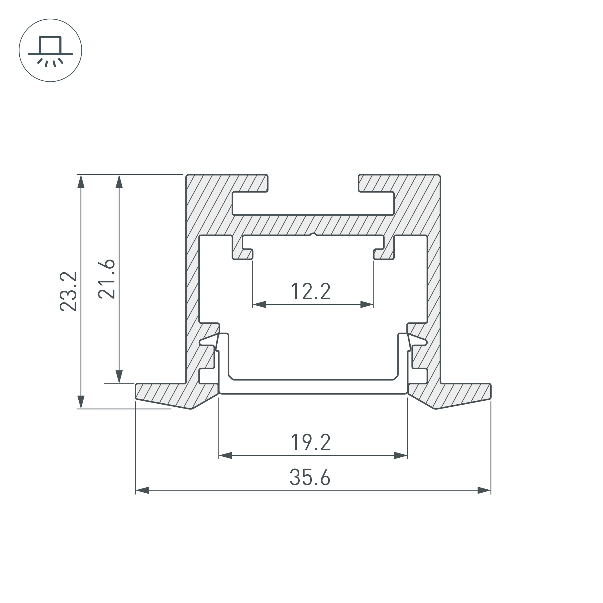 Встраиваемый профиль черного цвета с накладным фланцем из алюминия для основной и контурной подсветки помещений. Габаритные размеры профиля составляют 2500 мм в длину, 35,6 мм в ширину и 23,2 мм в высоту паз установки 25 мм. Площадка для установки светодиодных лент позволяет использовать ленту шириной до 12 мм и мощностью до 28,02 Вт/м. Это обеспечивает гибкость в выборе светодиодных лент и создает потрясающие световые решения.