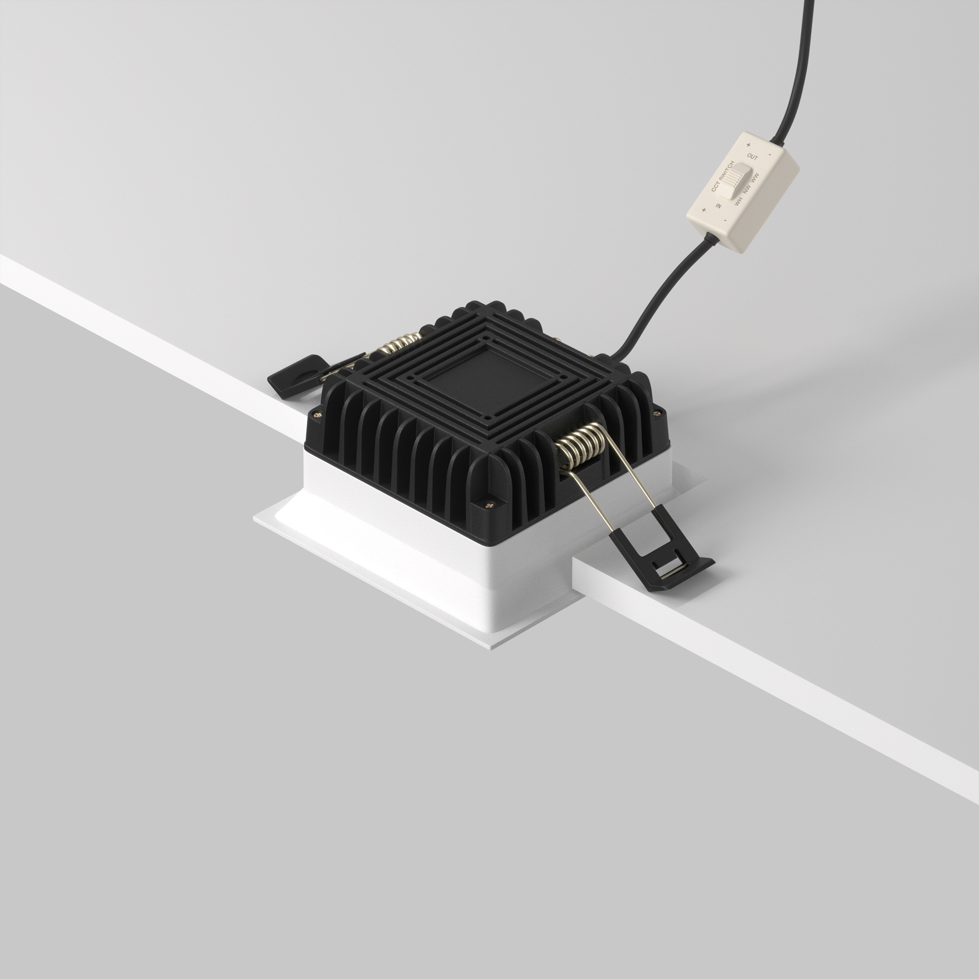 Материал арматуры – алюминий и пластик. Организация основного освещения в интерьере. Высокий коэффициент цветопередачи >90. Качественное отображение цветов. Утопленный матовый рассеиватель. Переключатель цветовой температуры. Повышенная степень пылевлагозащиты IP 44.